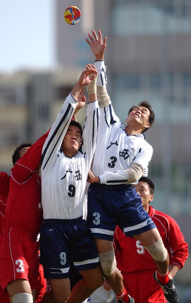 2003年9月12日,广西队9号队员覃维维(左二)和3号队友覃建达(左三)在民运会抢花炮决赛中与北京队队员争抢。最终,广西队以8比5战胜北京队。新华社记者 刘广铭 摄