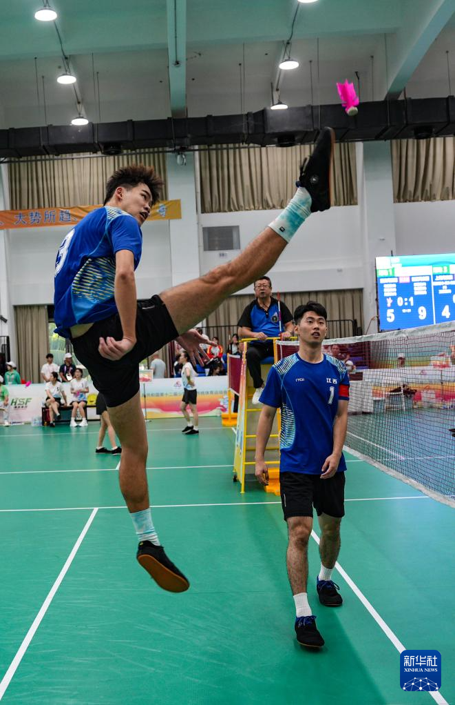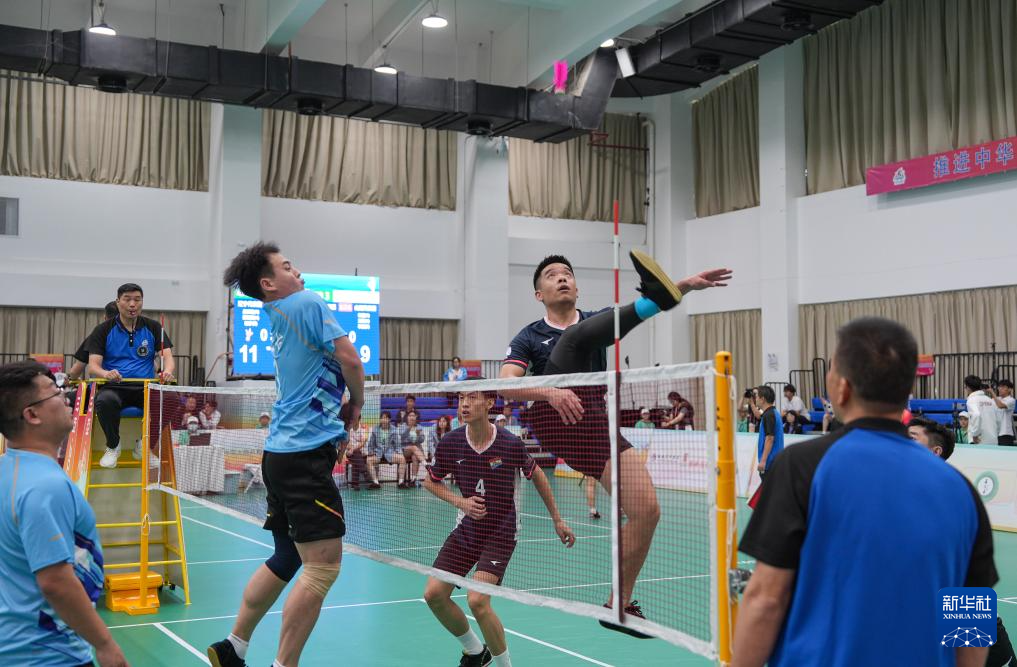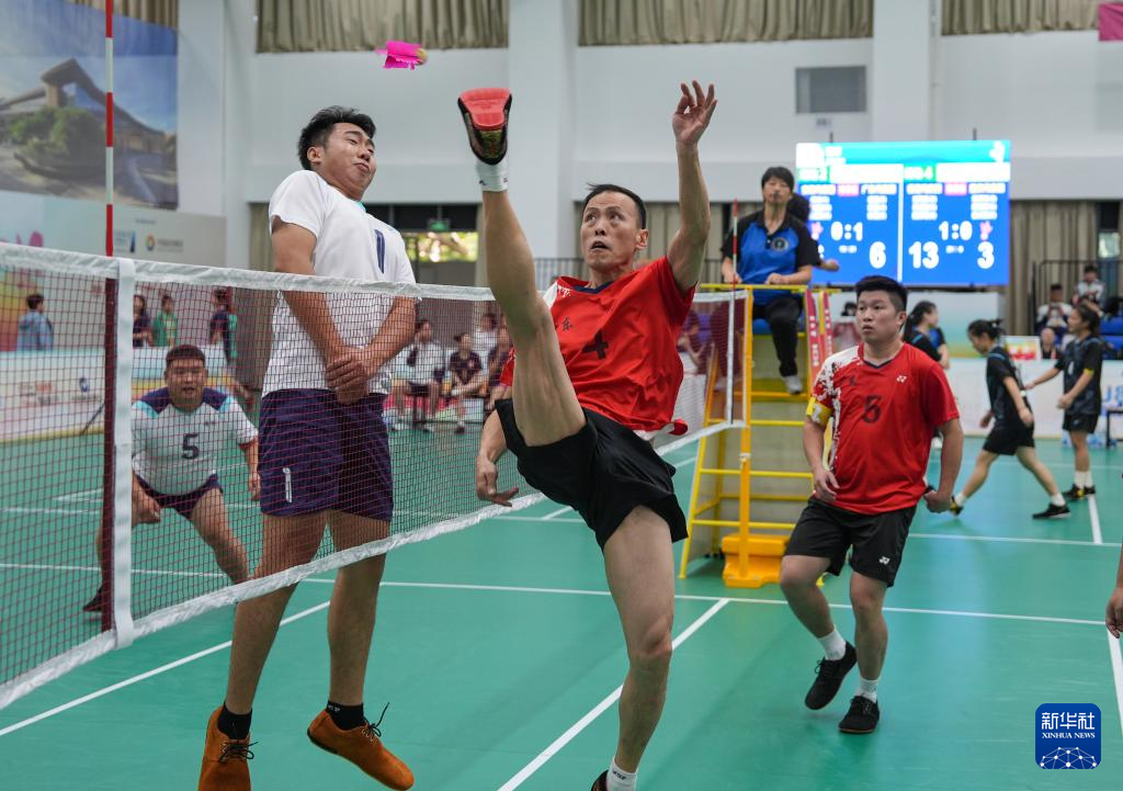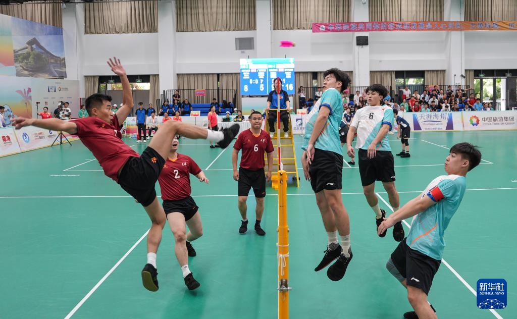 当日,第十二届全国少数民族传统体育运动会毽球男子三人小组赛在海南省三亚市举行。
