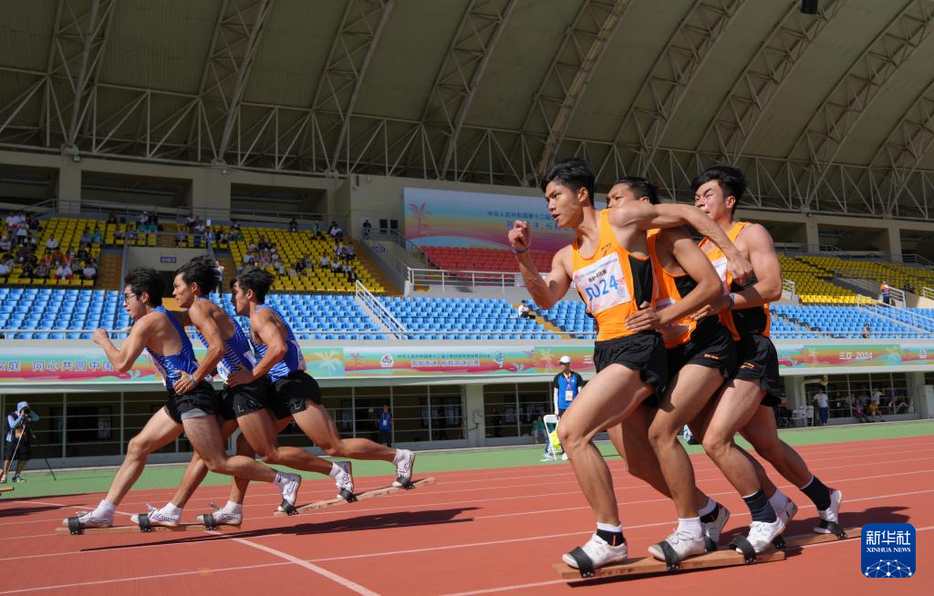 当日,第十二届全国少数民族传统体育运动会板鞋竞速男子三人板鞋60米次赛在海南省三亚市举行。