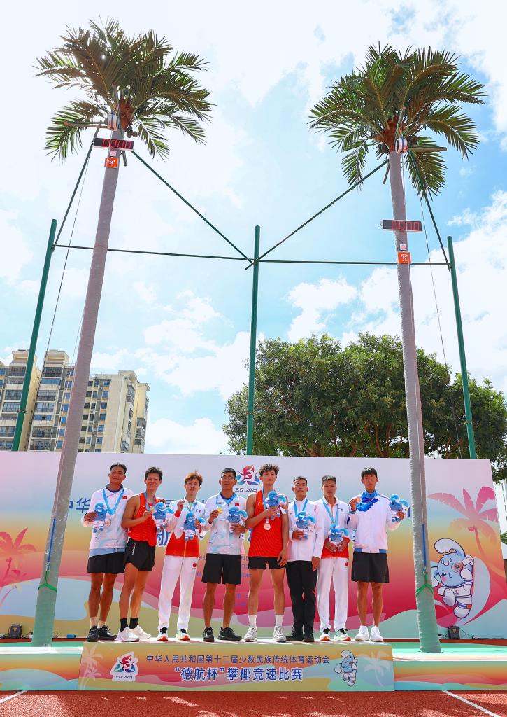 11月24日,获奖选手在颁奖仪式上合影。当日,第十二届全国少数民族传统体育运动会攀椰竞速男子9米决赛在西南大学三亚中学体育场举行。新华社记者 杨植森 摄