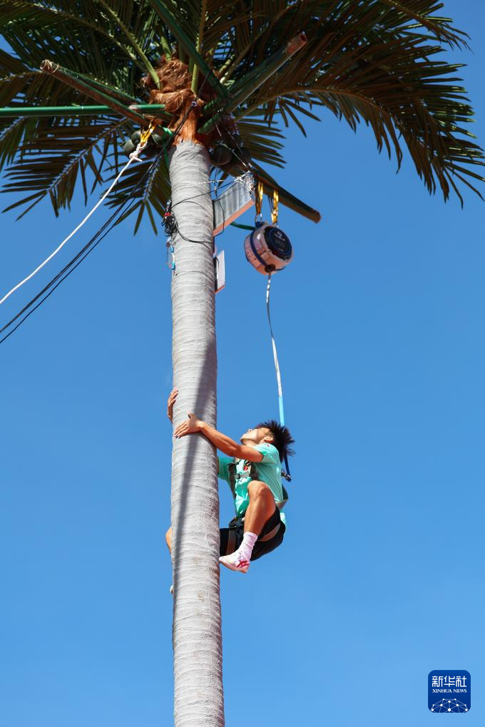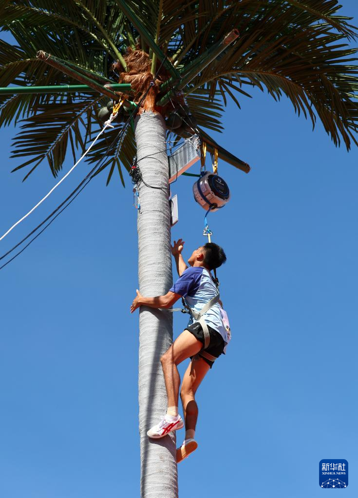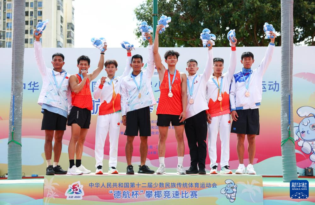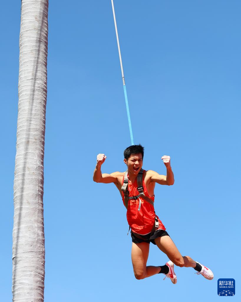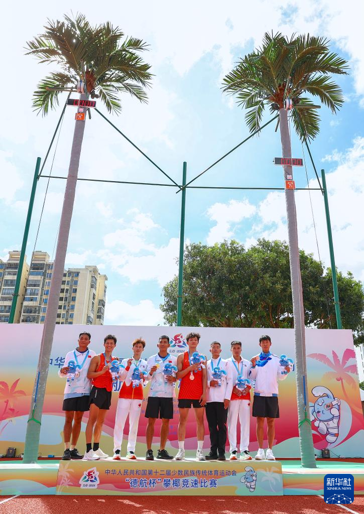 当日,第十二届全国少数民族传统体育运动会攀椰竞速男子9米决赛在西南大学三亚中学体育场举行。