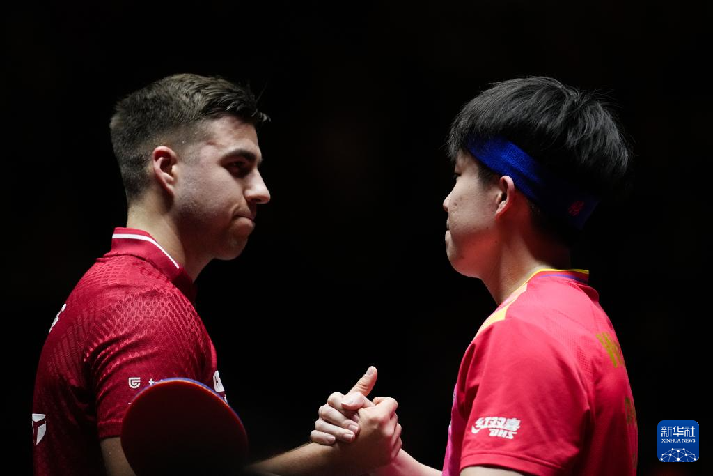 11月23日,王楚钦(右)在比赛后与达科·约奇克相互致意。