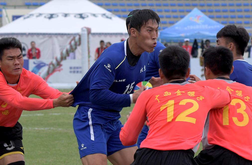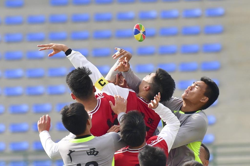 2019年9月14日,北京队队员贺忠亮(左二)在比赛中争抢。当日,在郑州举行的第十一届全国少数民族传统体育运动会花炮项目决赛中,广西队以4:3战胜北京队,获得一等奖。新华社记者李安摄