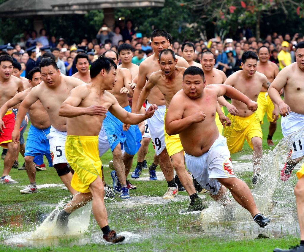 2019年9月9日,广西队与重庆队在第十一届全国少数民族传统体育运动会花炮第一轮比赛中拼抢。新华社记者黄孝邦摄