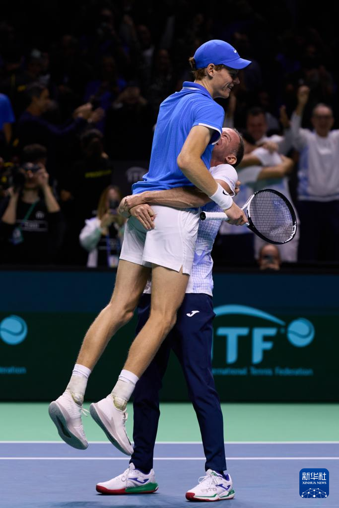11月24日,意大利队选手辛纳(上)和教练庆祝胜利,他2比0战胜荷兰队选手塔隆·格里克斯普尔。