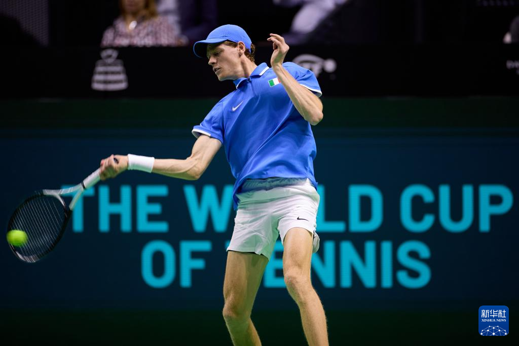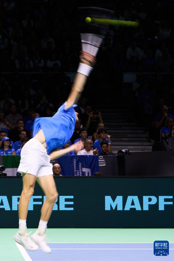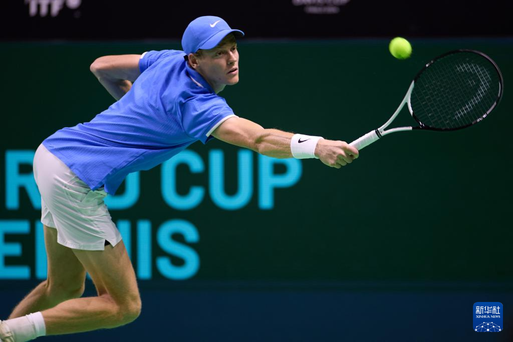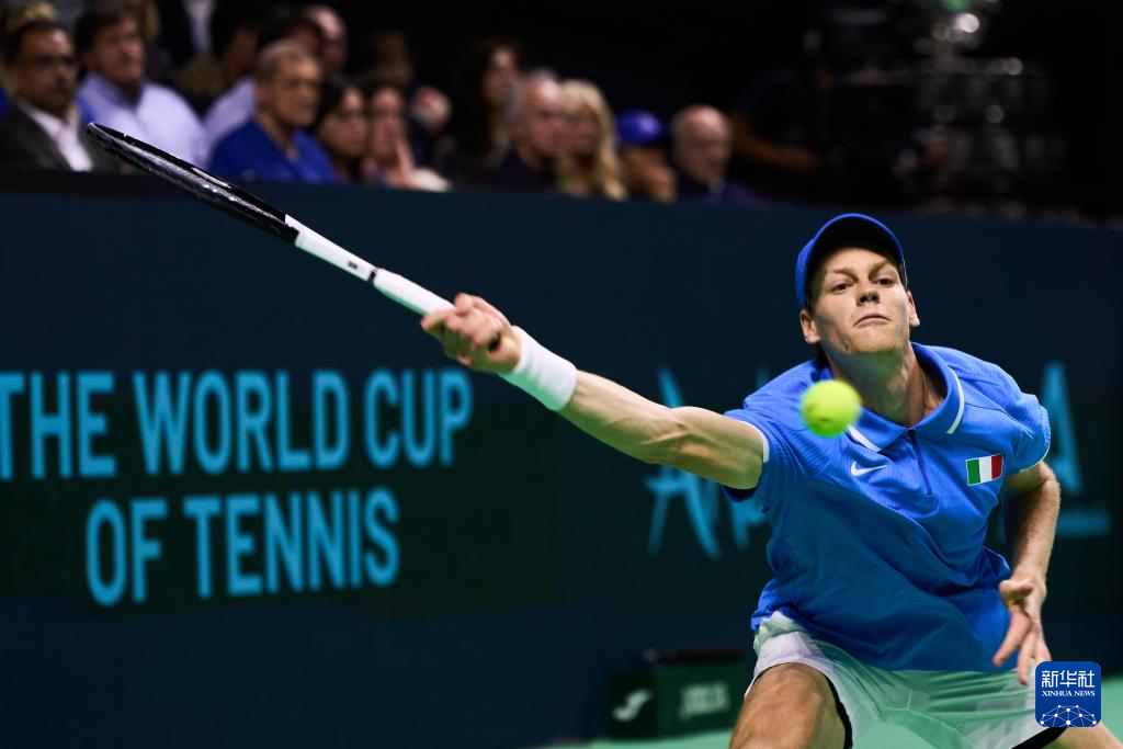 11月24日,意大利队选手辛纳在比赛中回球,他2比0战胜荷兰队选手塔隆·格里克斯普尔。