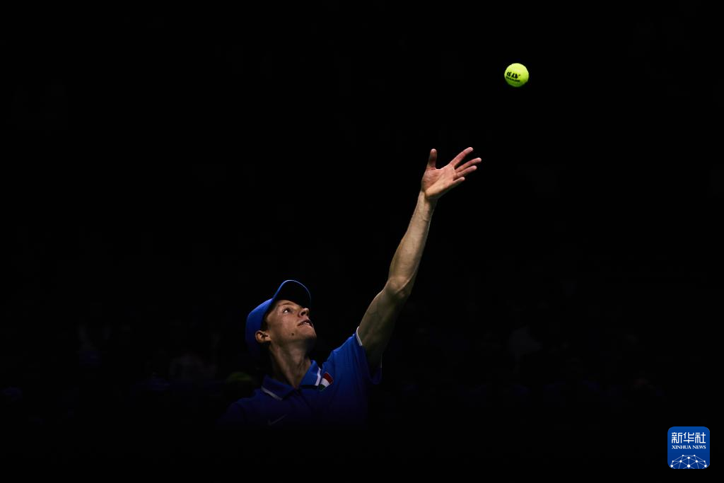 11月24日,意大利队选手辛纳在比赛中发球,他2比0战胜荷兰队选手塔隆·格里克斯普尔。