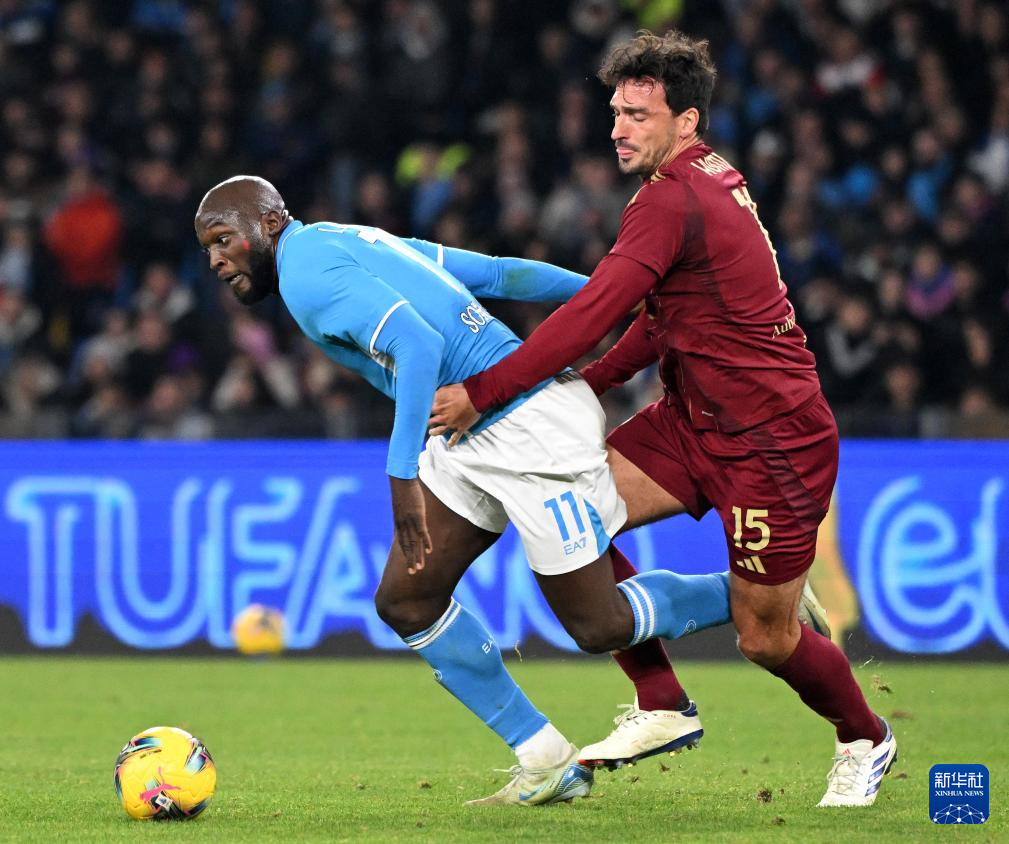 11月24日,那不勒斯队球员卢卡库(左)与罗马队球员胡梅尔斯在比赛中拼抢。