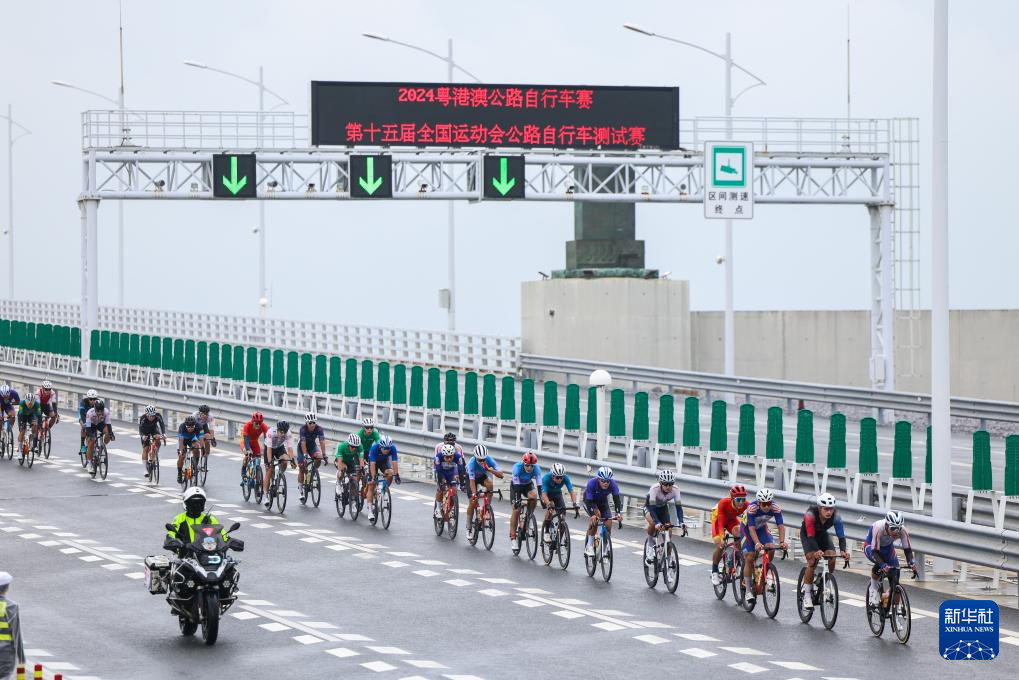 当日,2024粤港澳公路自行车赛暨第十五届全国运动会公路自行车测试赛举行,比赛跨越粤港澳三地,途经港珠澳大桥,赛道全程230公里。