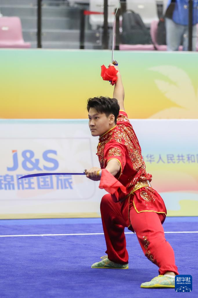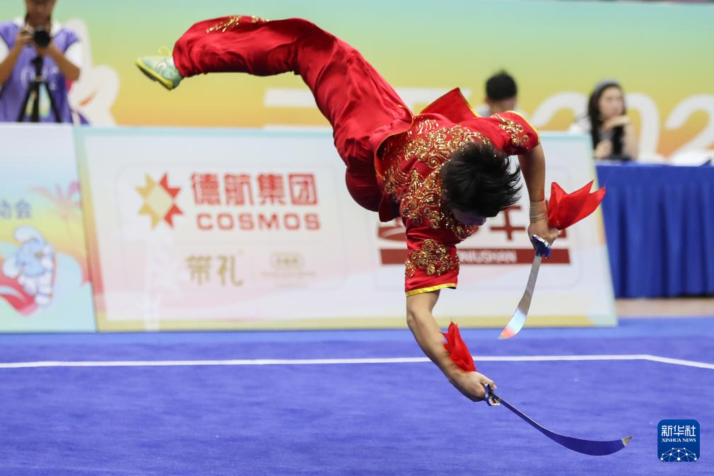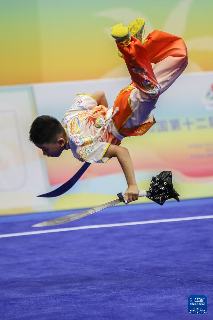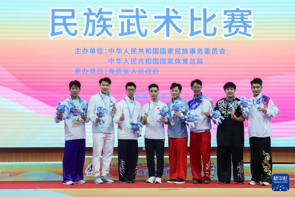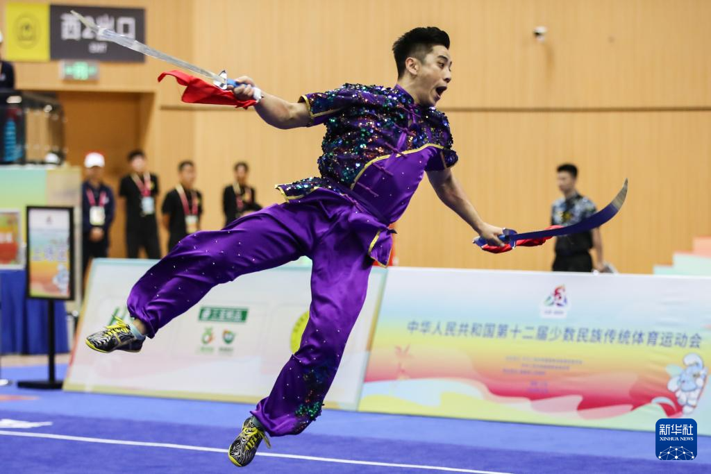 当日,第十二届全国少数民族传统体育运动会民族武术男子传统双器械决赛在海南三亚举行。