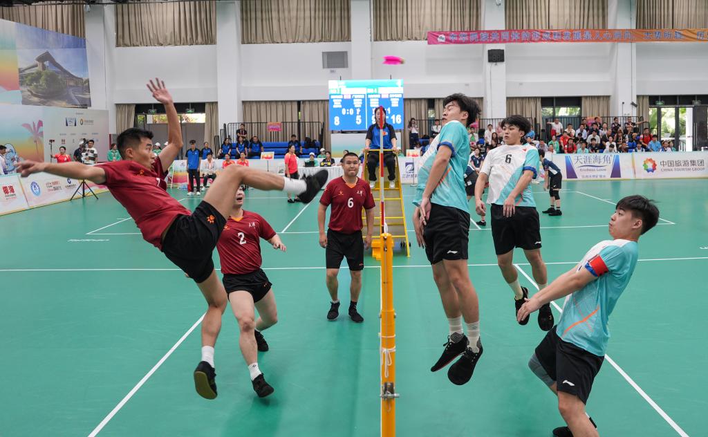 11月24日,第十二届全国少数民族传统体育运动会毽球男子三人小组赛在海南省三亚市举行,图为天津队和广西队比赛现场。新华社记者 晋美多吉 摄
