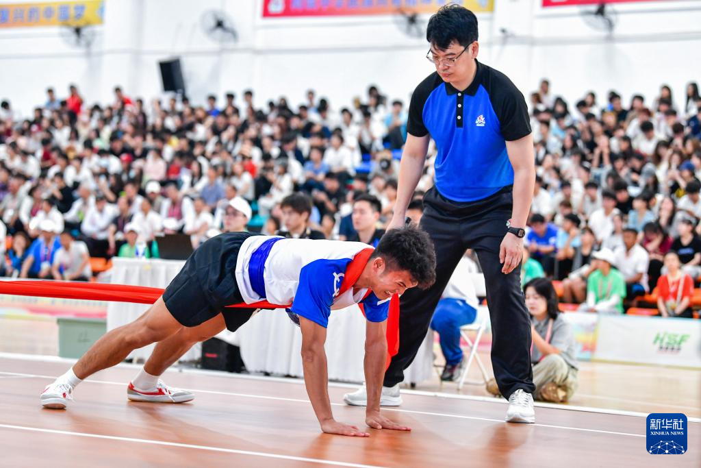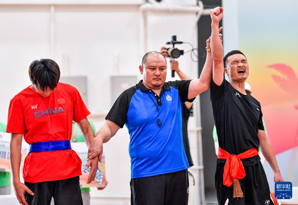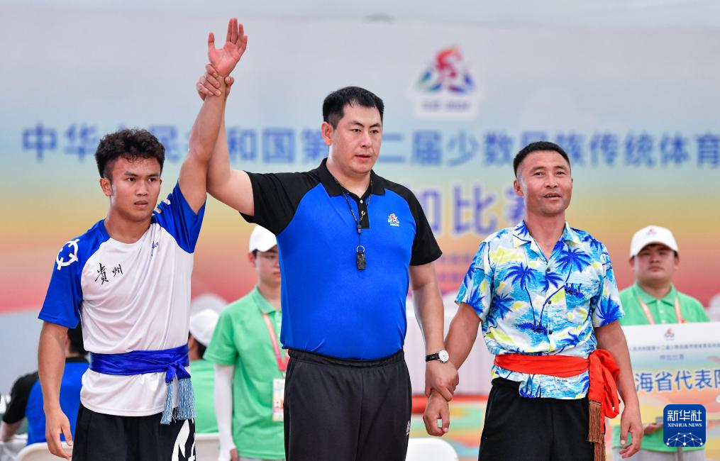 当日,第十二届全国少数民族传统体育运动会押加61公斤级四分之一决赛在海南三亚举行。