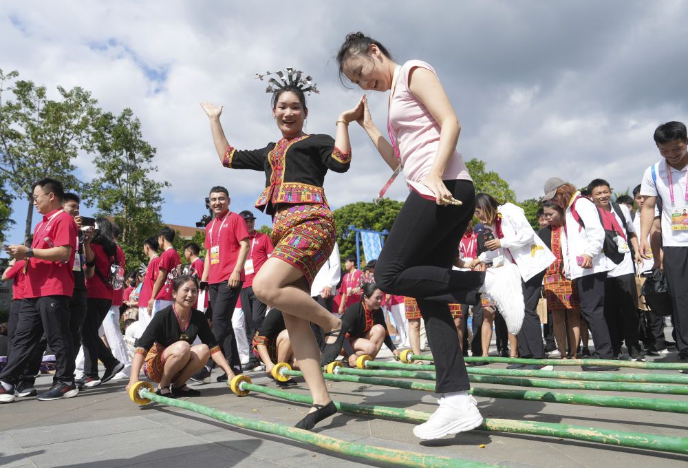 ↑演员在欢迎仪式上表演竹竿舞。新华社记者 张博文 摄