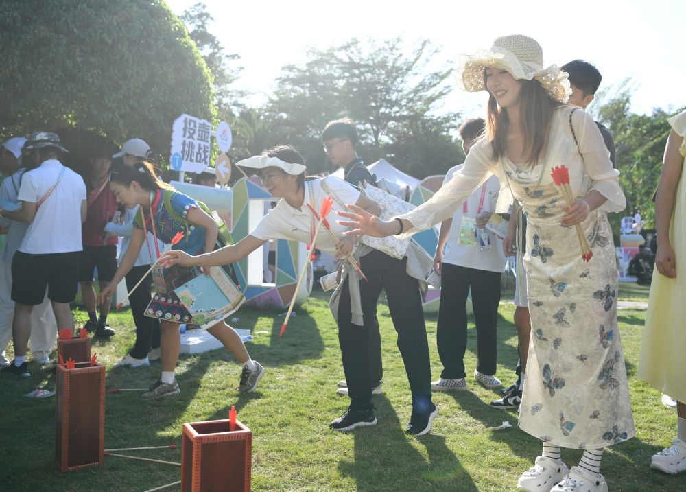 ↑代表团成员在民俗社火集区域体验投壶。新华社记者 杨文斌 摄
