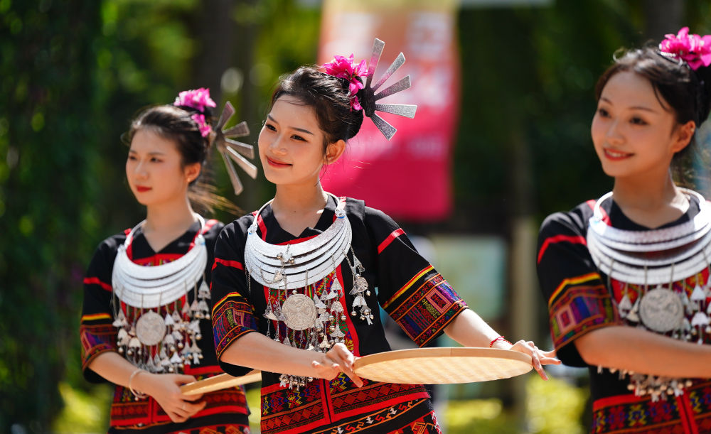 ↑演员欢迎广西代表团成员参加活动。新华社记者 孙凡越 摄