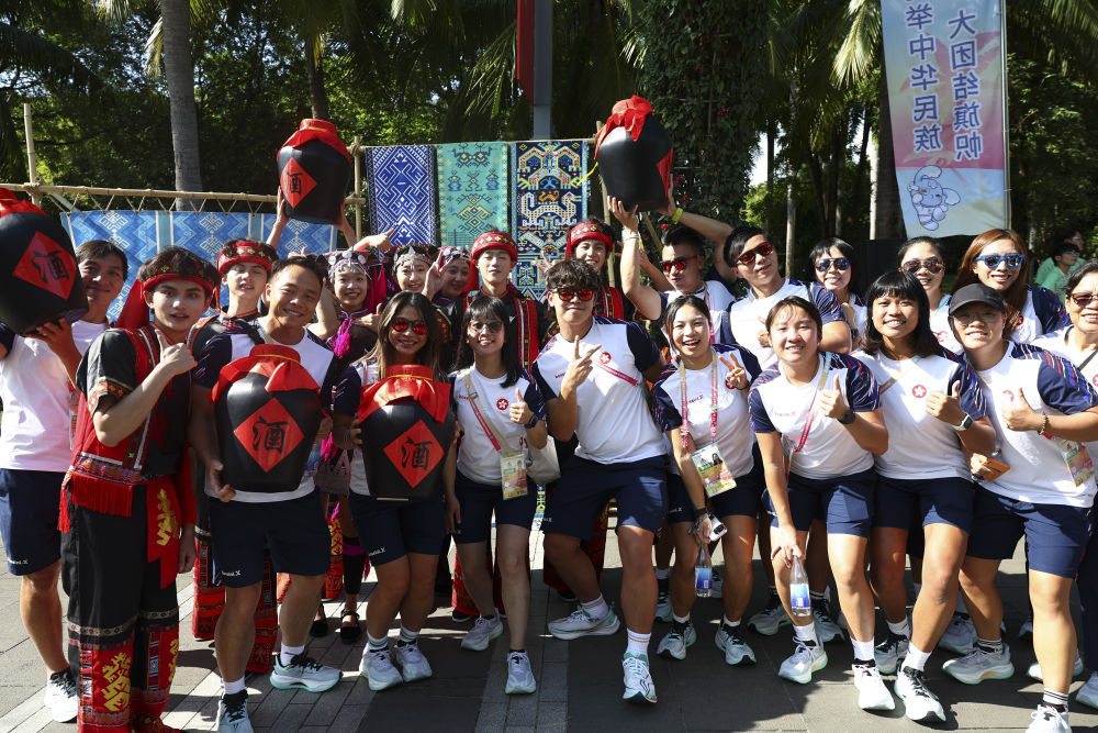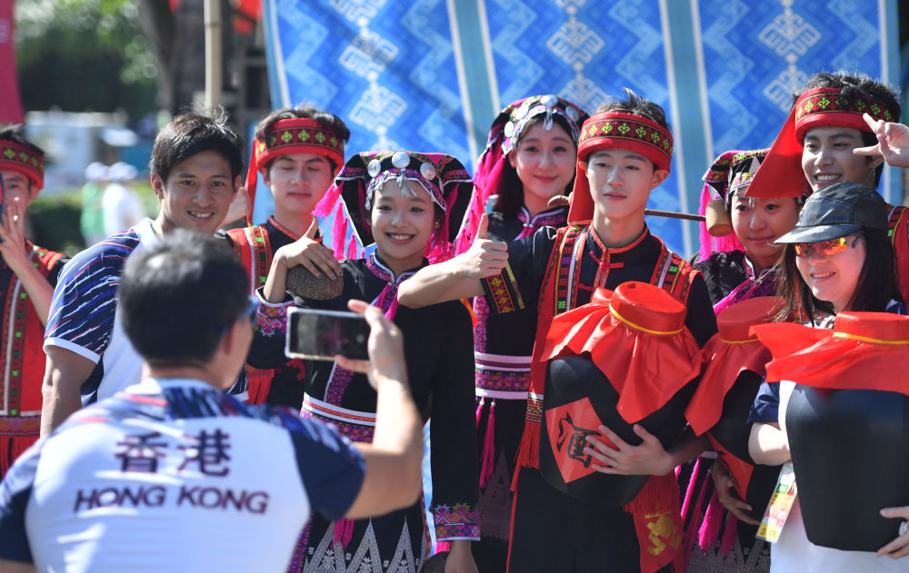 ↑香港特别行政区代表团成员和演员在欢迎仪式上合影。新华社记者 杨植森 摄