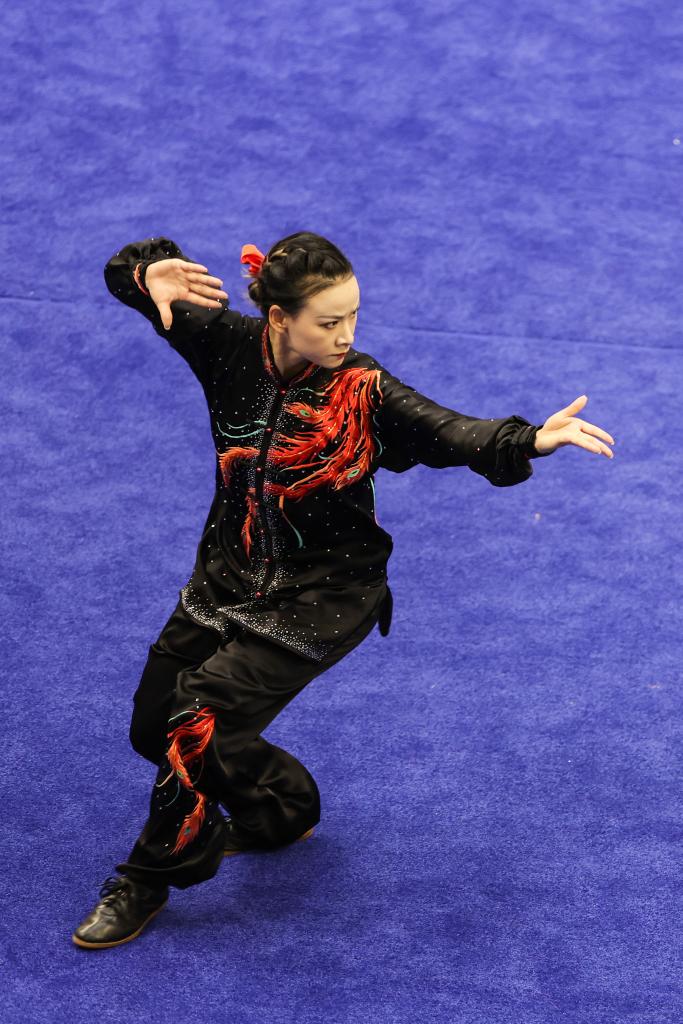 红色头绳束发,一袭黑衣上凤凰飞舞,在24日下午进行的女子传统一类拳决赛上,云南队选手段静的一套八卦掌,在动静之间刚柔急缓、式式相连。