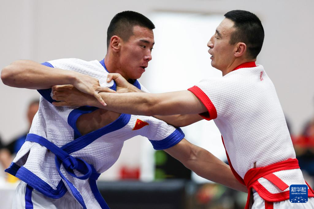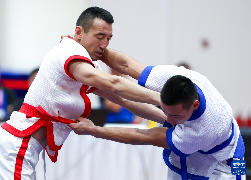 11月25日,河南队选手刘小涛(左)和宁夏队选手其勒格尔在比赛中。最终刘小涛获胜。