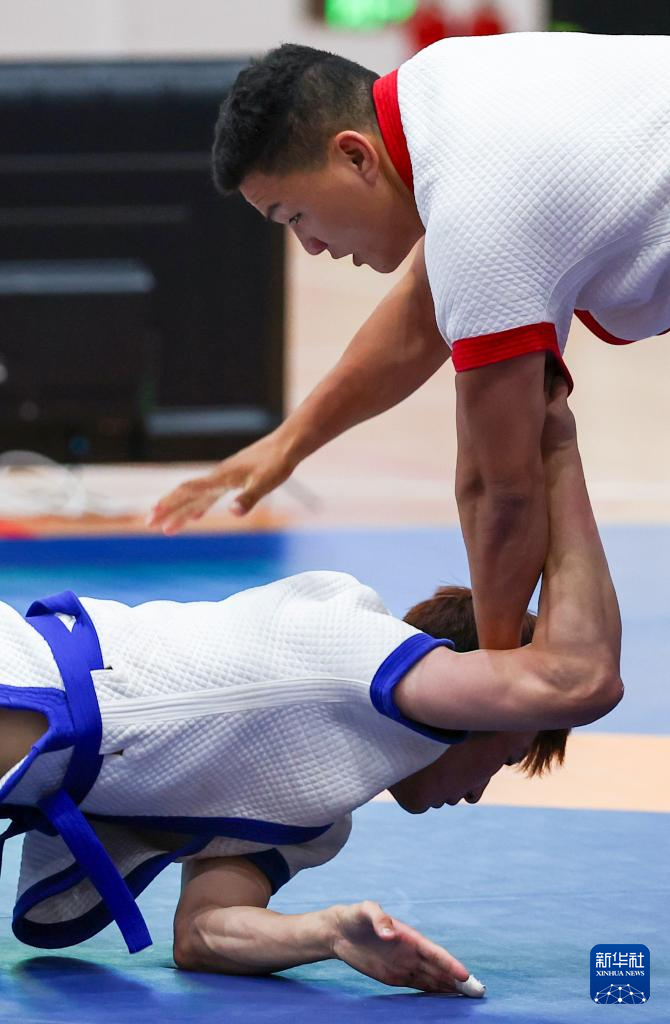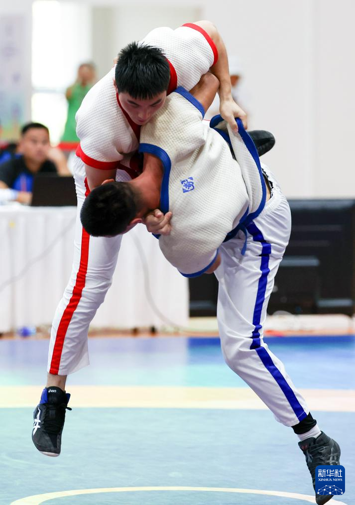 当日,第十二届全国少数民族传统体育运动会民族式摔跤绊跤75公斤级小组赛在海南三亚举行。
