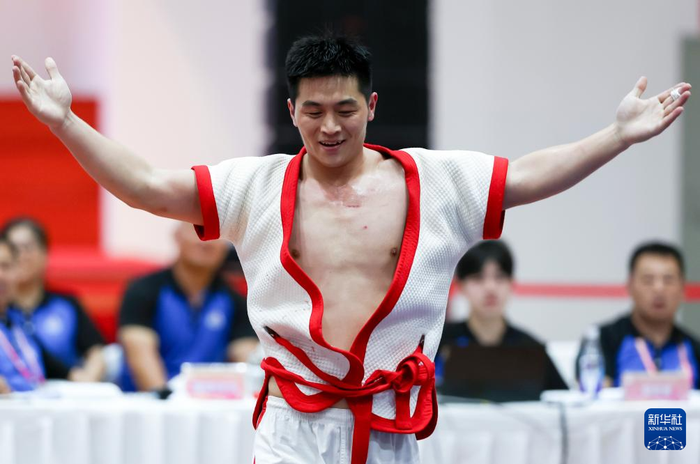11月25日,河南队选手刘小涛庆祝战胜宁夏队选手其勒格尔。