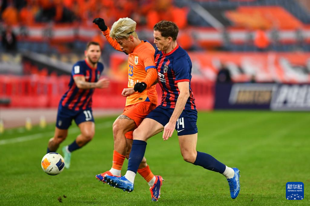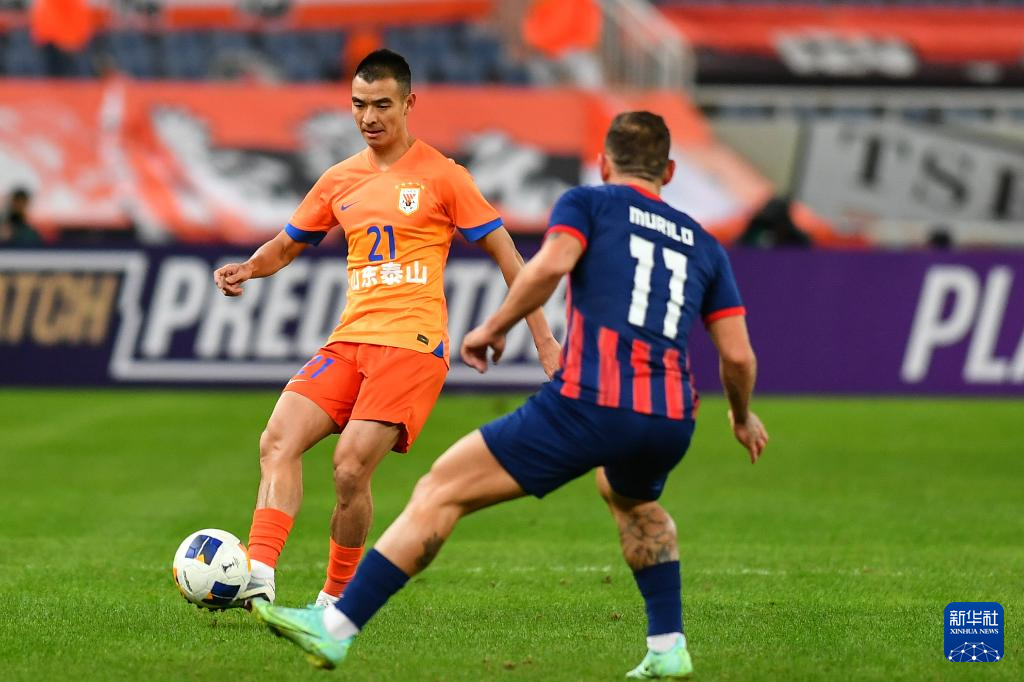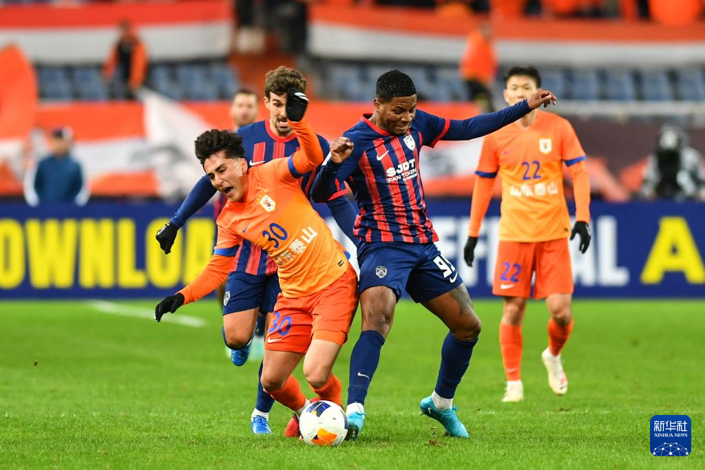 11月26日,山东泰山队球员谢文能(前左)在比赛中拼抢。