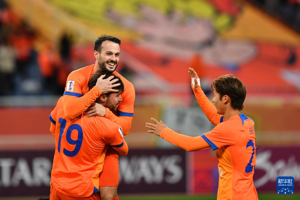 11月26日,山东泰山队球员泽卡(左前)在比赛中进球后与队友庆祝。
