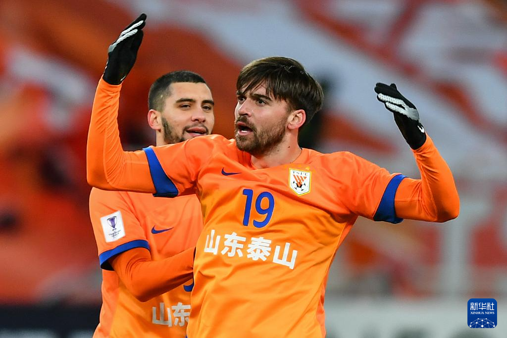11月26日,山东泰山队球员泽卡(右)在比赛中进球后庆祝。