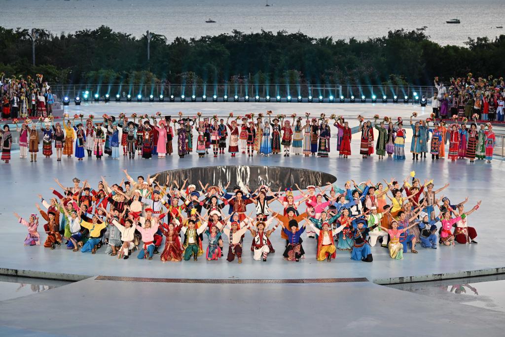 在“天涯海角星”纪念雕塑附近,台湾少数民族代表团表演者身着特色民族服饰,手拉手围成一个圆,在《我们都是一家人》的歌声中,为观众献上热情舞蹈。不少代表团成员进入圆圈中,用手机将这份欢乐与温馨定格。