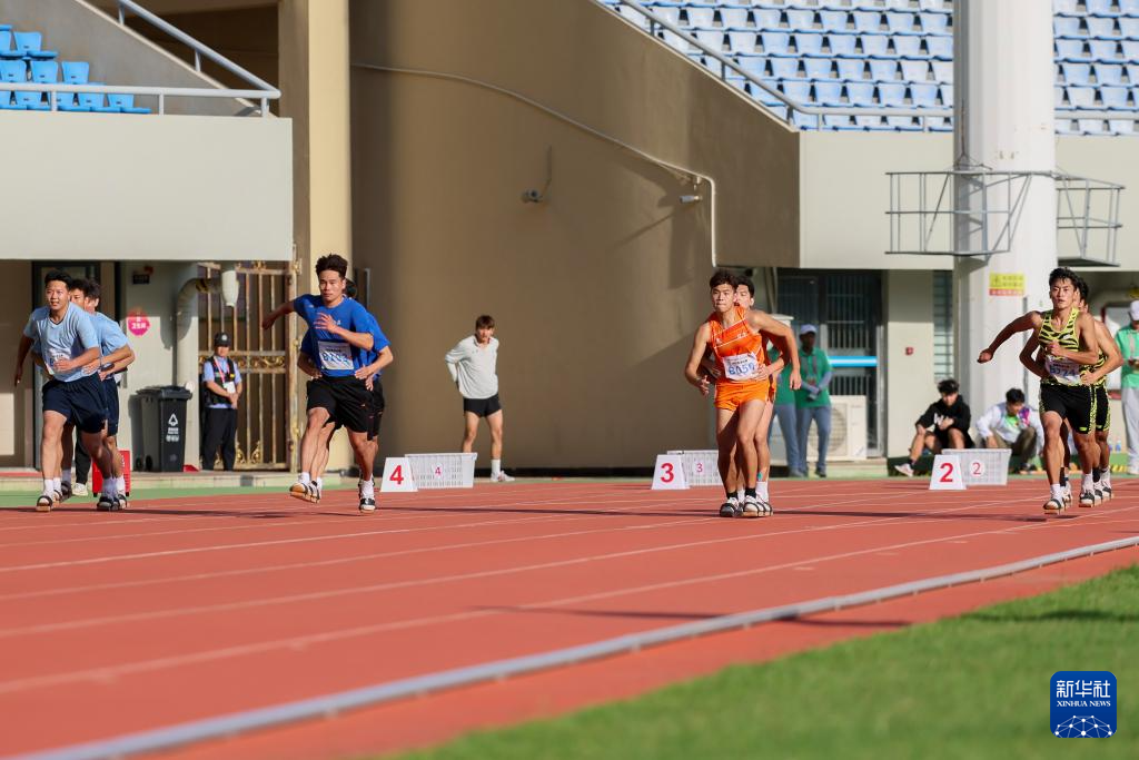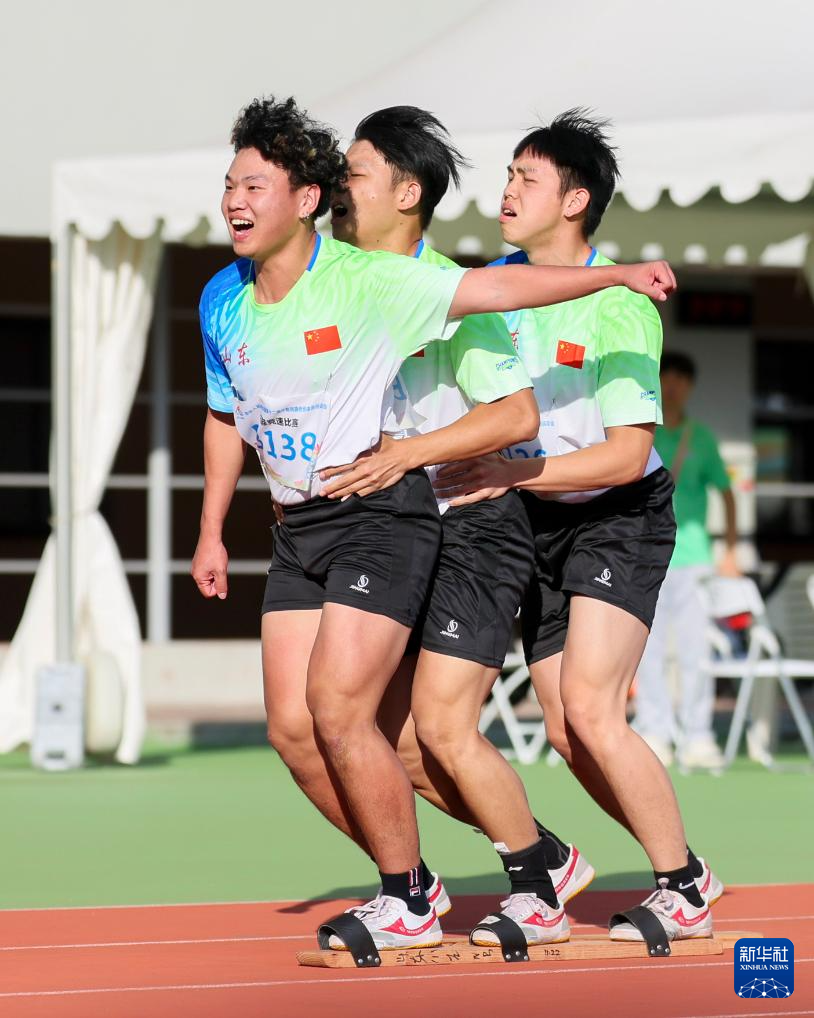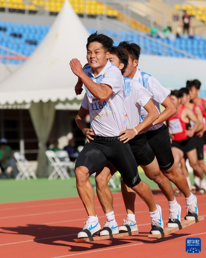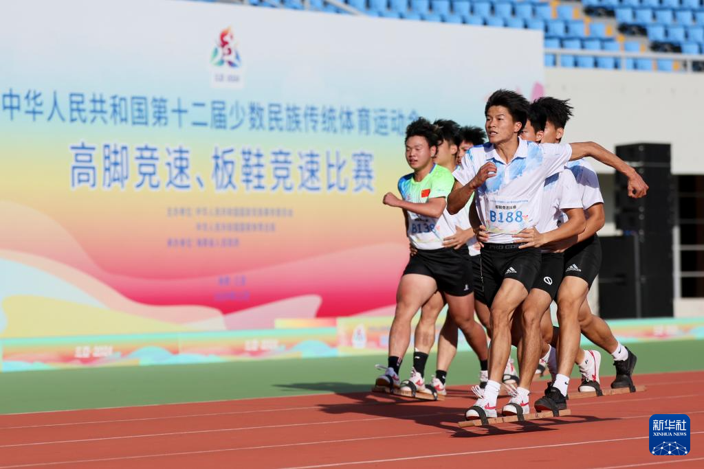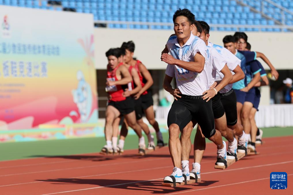 当日,第十二届全国少数民族传统体育运动会板鞋竞速男子100米次赛在海南三亚举行。