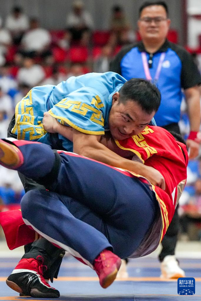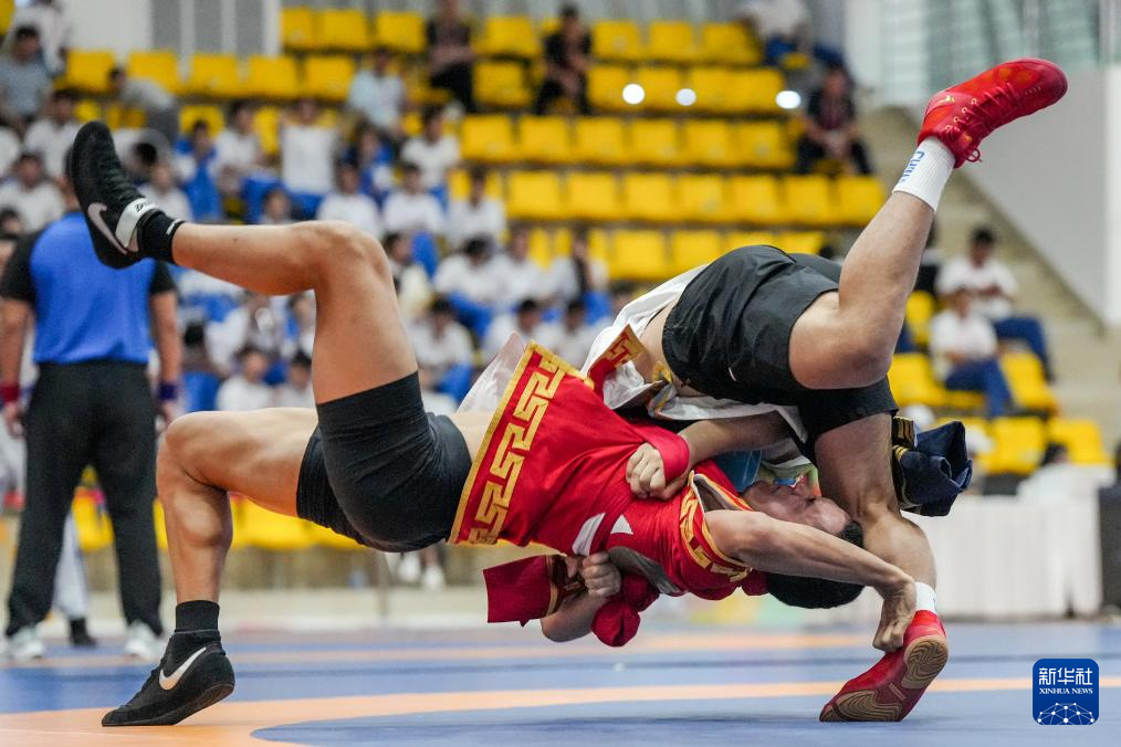 当日,第十二届全国少数民族传统体育运动会民族式摔跤北嘎淘汰赛第一轮比赛在海南省三亚市举行。