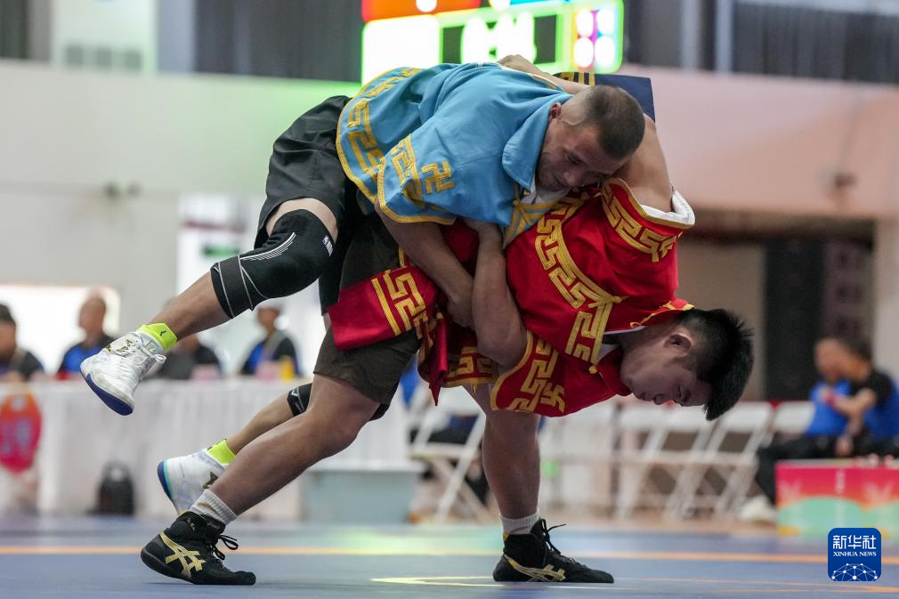 11月27日,重庆队选手乌日图那斯吐(左)与天津队选手阿拉腾松布尔在87公斤级比赛中。最终,乌日图那斯吐战胜阿拉腾松布尔。