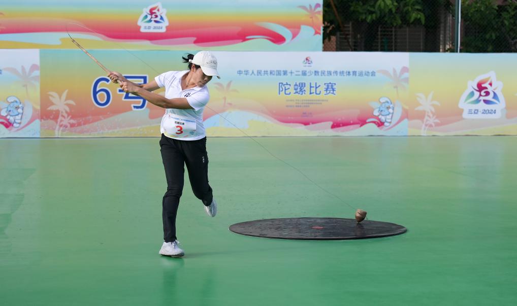 11月27日,海南队选手吴跃偏在比赛中投掷陀螺。新华社记者 杨光 摄