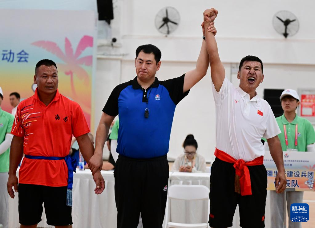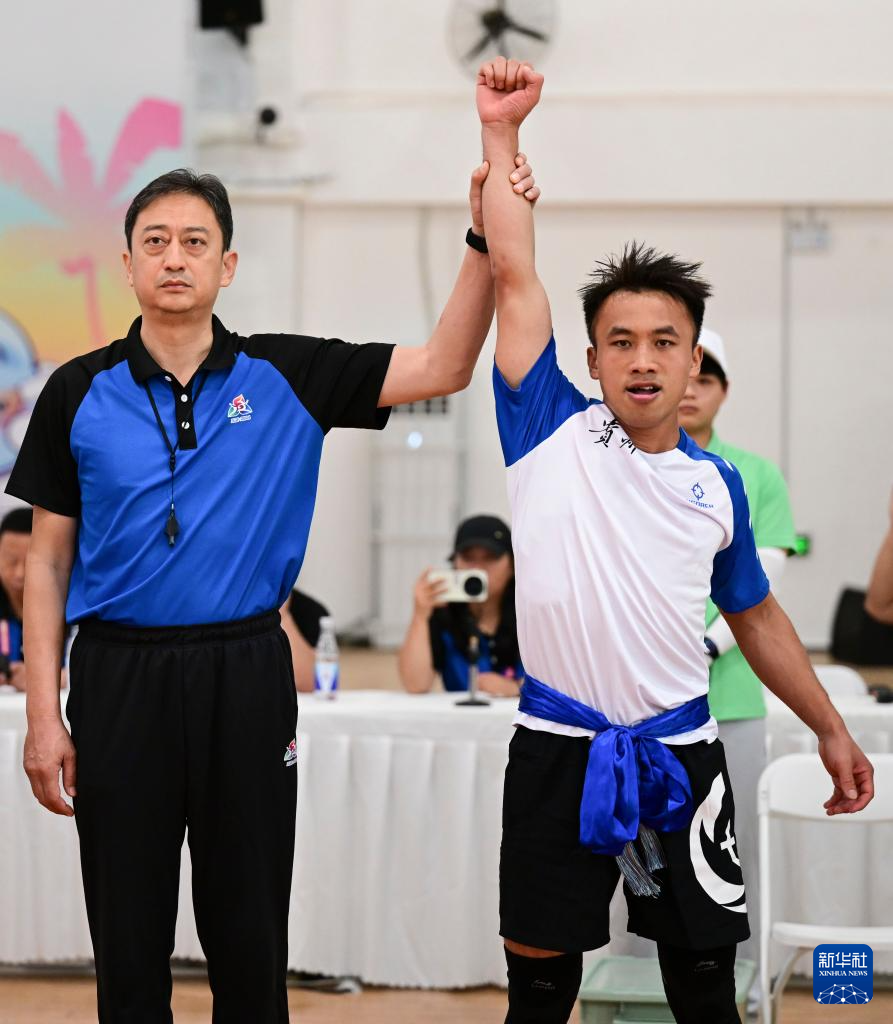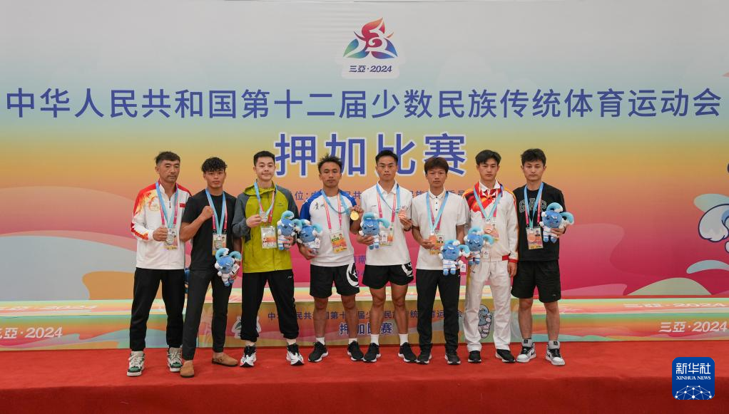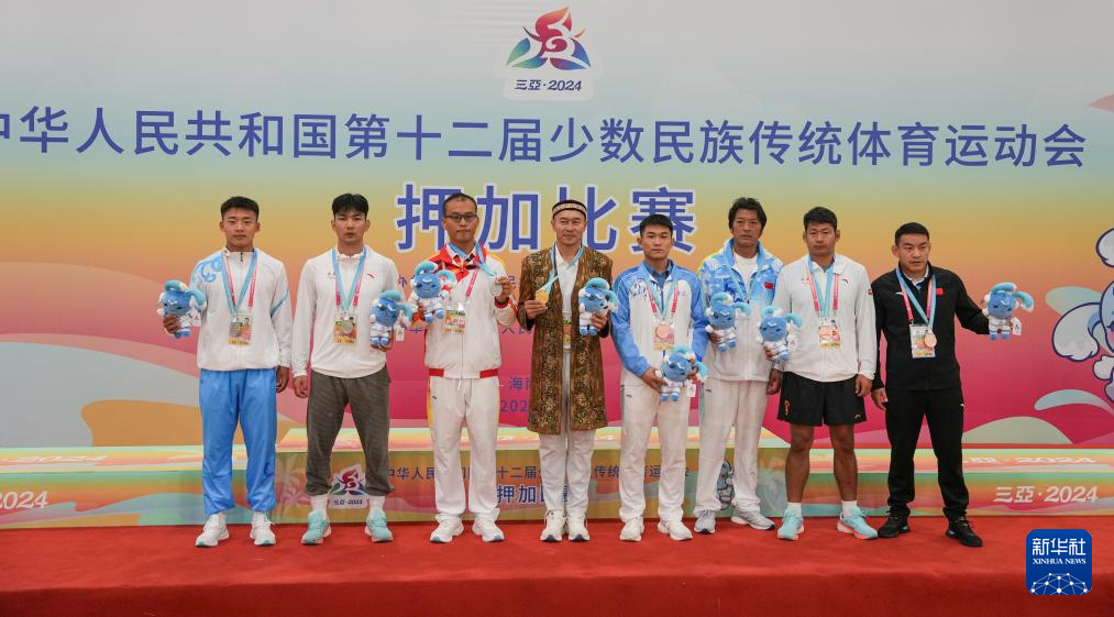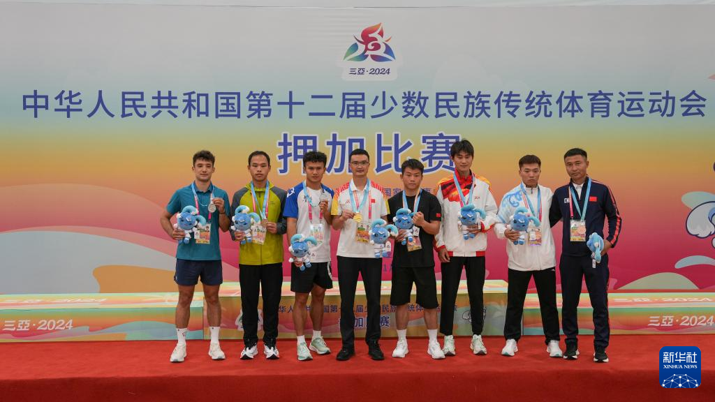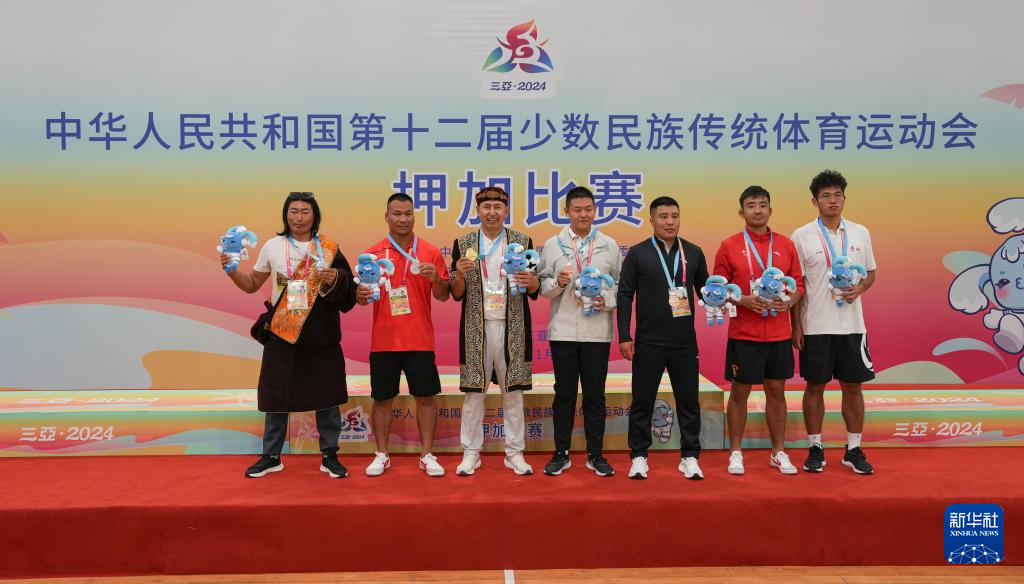 当日,第十二届全国少数民族传统体育运动会押加项目55、61、68、76、85公斤级五个组别的决赛在海南省三亚市举行。
