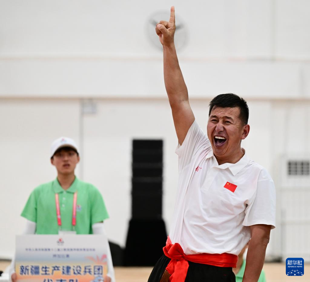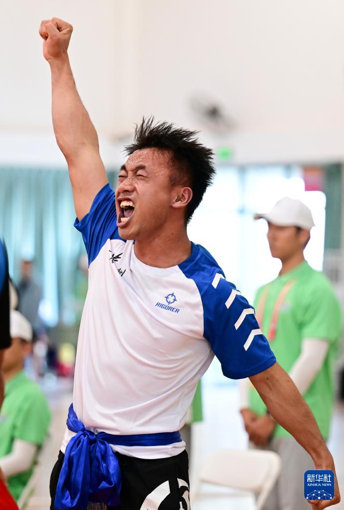 11月27日,新疆生产建设兵团选手提亚那克·黑沙别克在85公斤级决赛获胜后庆祝。他战胜海南队选手吉航敬,获得一等奖。