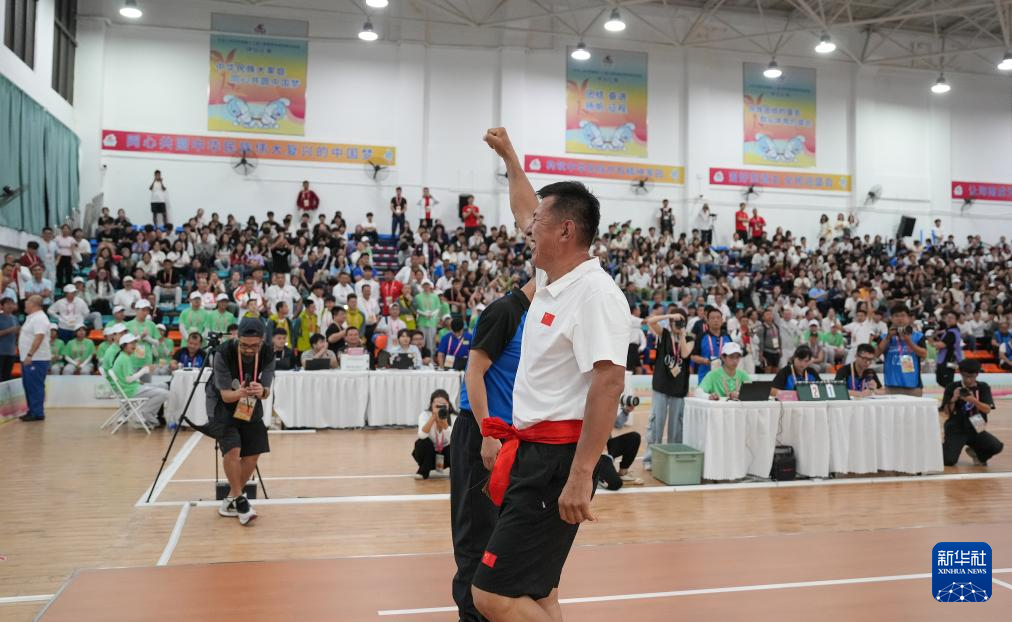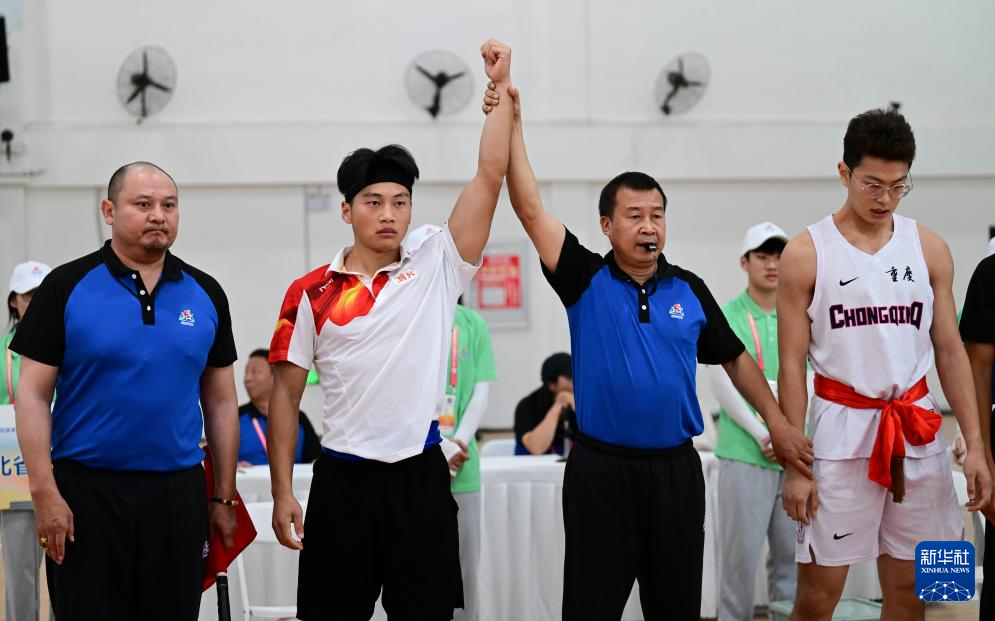 11月27日,湖北队选手向燚(右)在押加项目68公斤级决赛获胜后庆祝。他战胜重庆队选手王孝兴(左),获得一等奖。