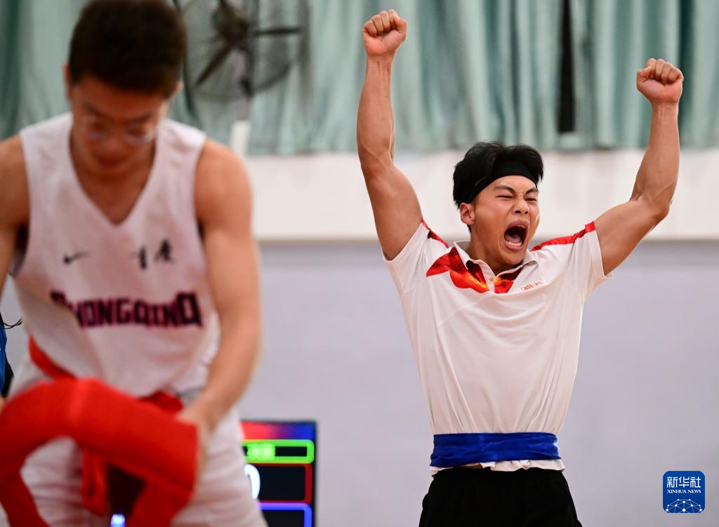 11月27日,贵州队选手张仁信在55公斤级决赛后庆祝。他战胜重庆队选手王珍宽,获得一等奖。