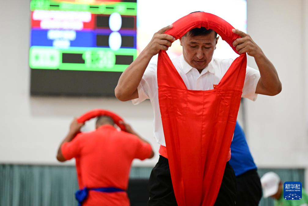 11月27日,新疆生产建设兵团队选手提亚那克·黑沙别克在85公斤级决赛中。他战胜海南队选手吉航敬,获得一等奖。