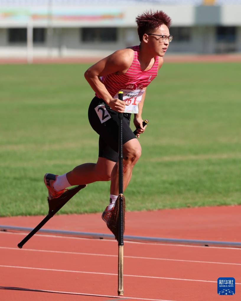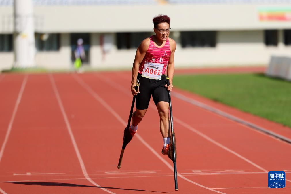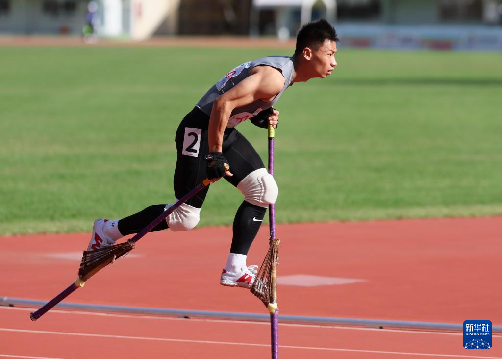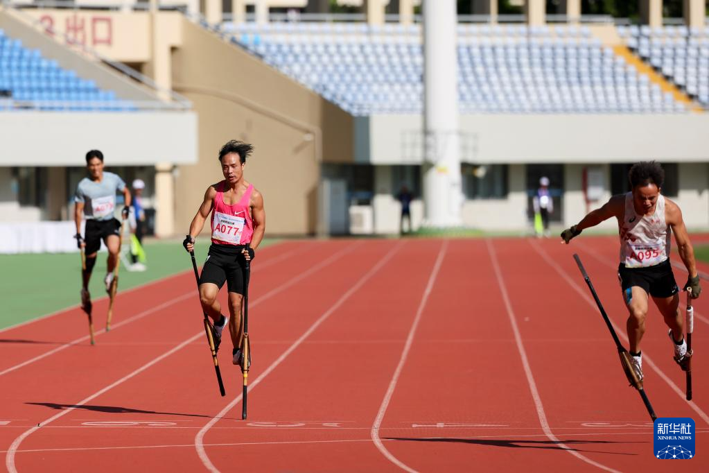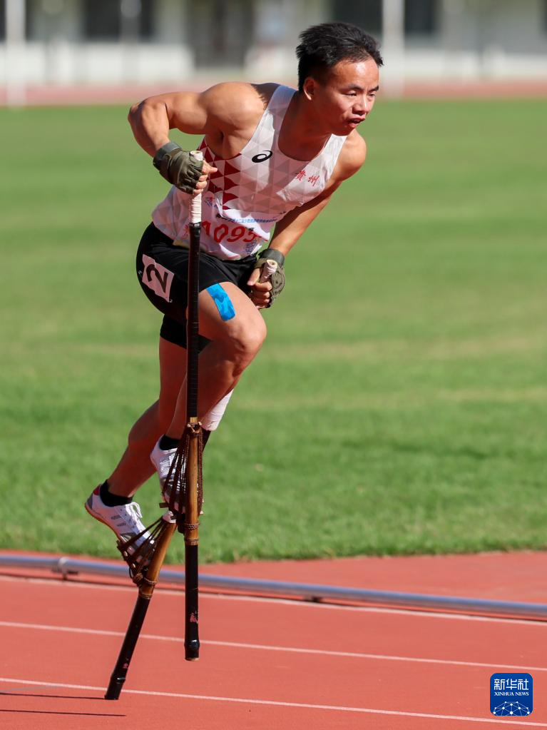 当日,第十二届全国少数民族传统体育运动会高脚竞速男子400米复赛在海南三亚举行。