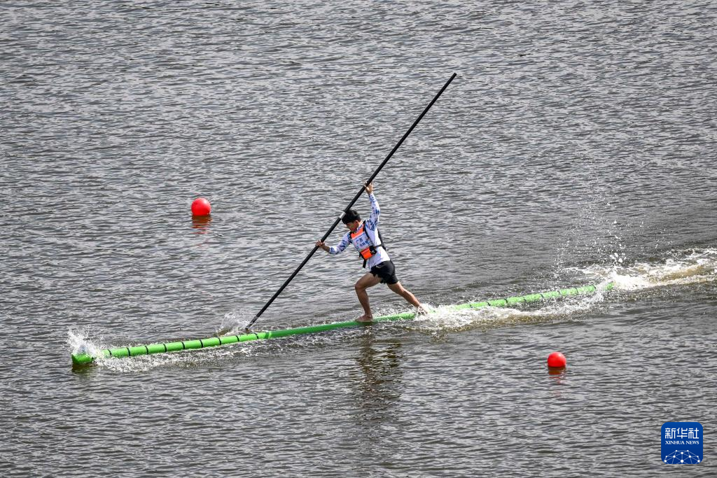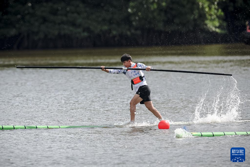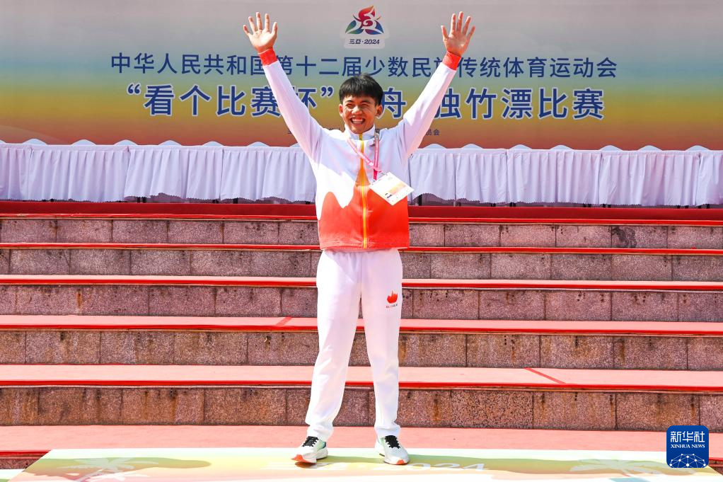 当日,第十二届全国少数民族传统体育运动会独竹漂男子组60米直道赛在海南省三亚市举行。