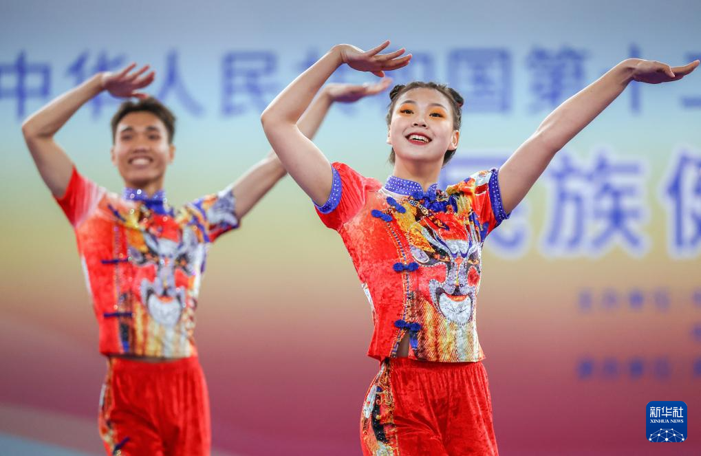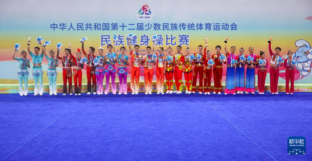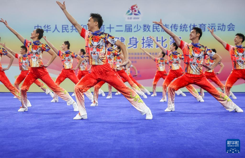 当日,第十二届全国少数民族传统体育运动会民族健身操比赛在海南三亚举行。