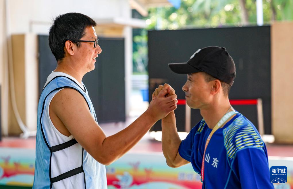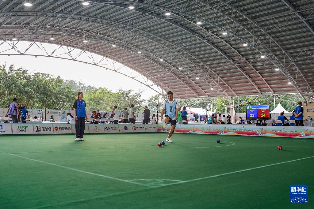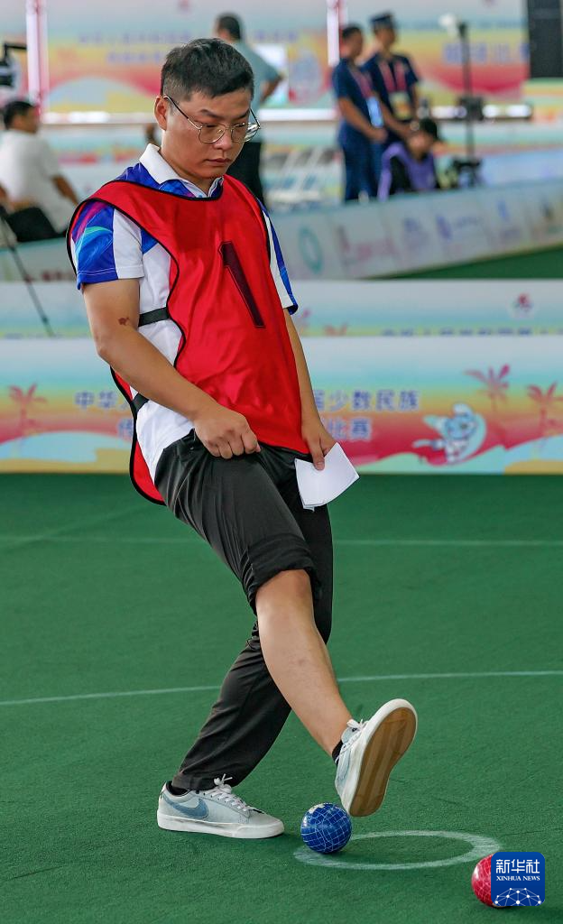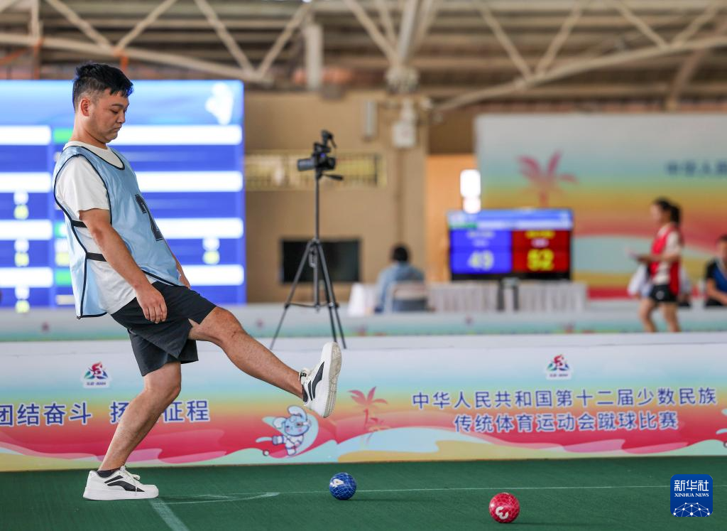 当日,第十二届全国少数民族传统体育运动会蹴球项目男子单蹴8进4淘汰赛在海南三亚学院风雨球场举行。