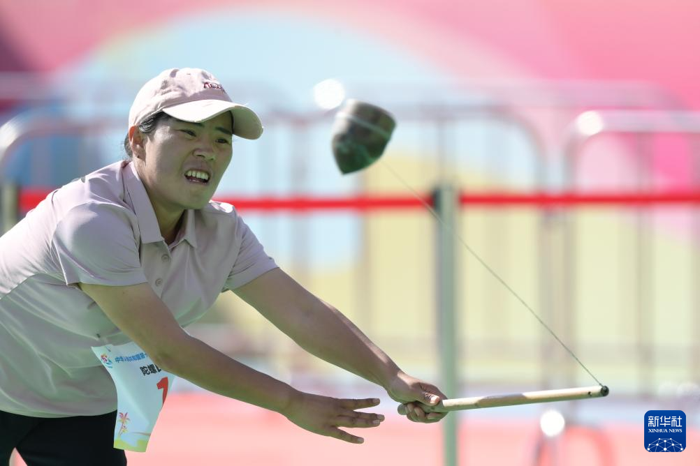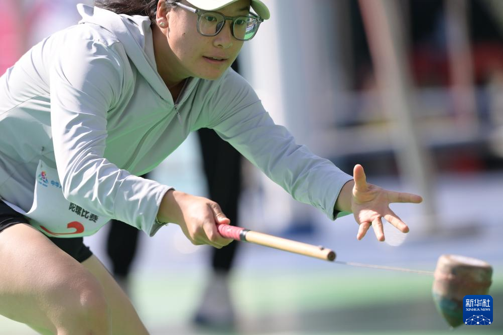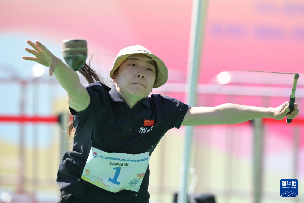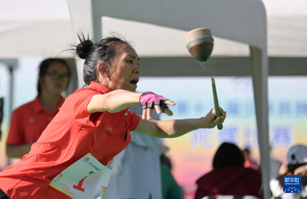 11月28日,宁夏队选手杨娟在比赛中投掷陀螺。最终,宁夏队29比51负于湖北队。