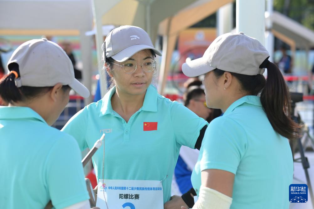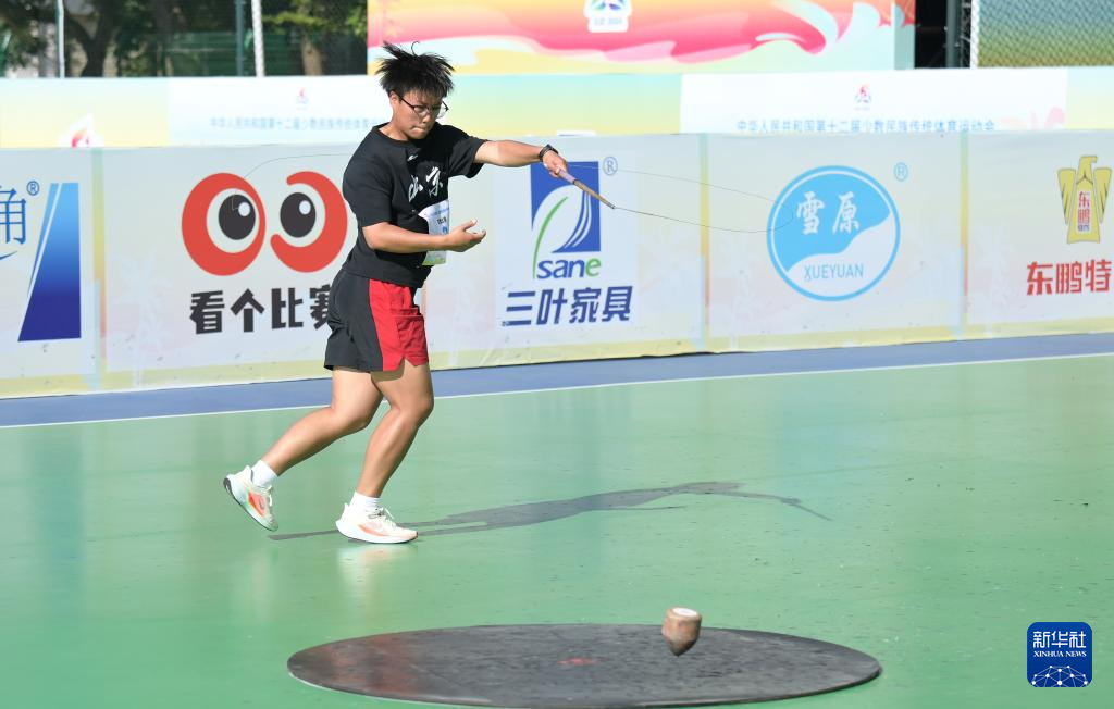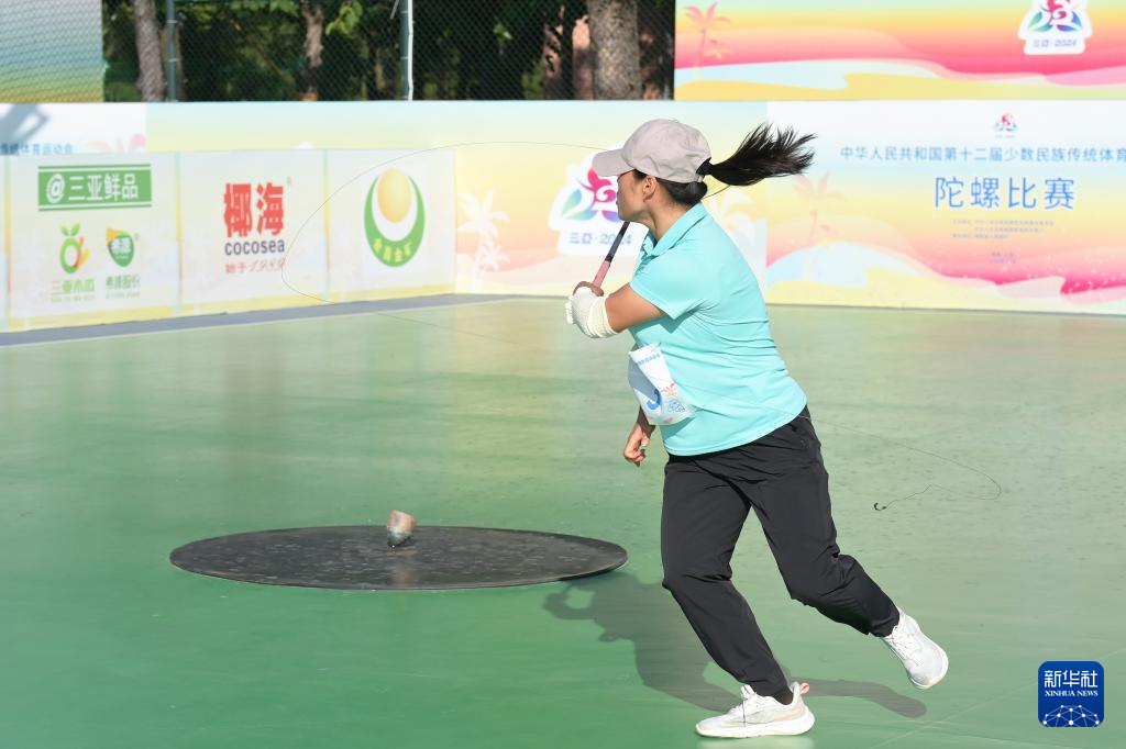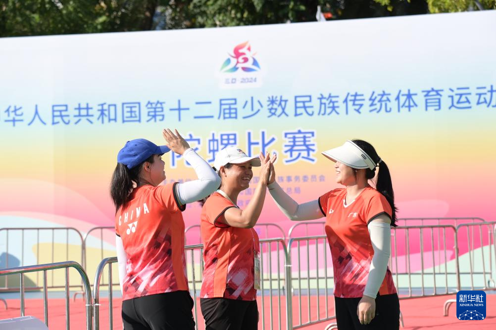 当日,第十二届全国少数民族传统体育运动会陀螺女子团体第一阶段(第四轮)比赛在海南省三亚市举行。