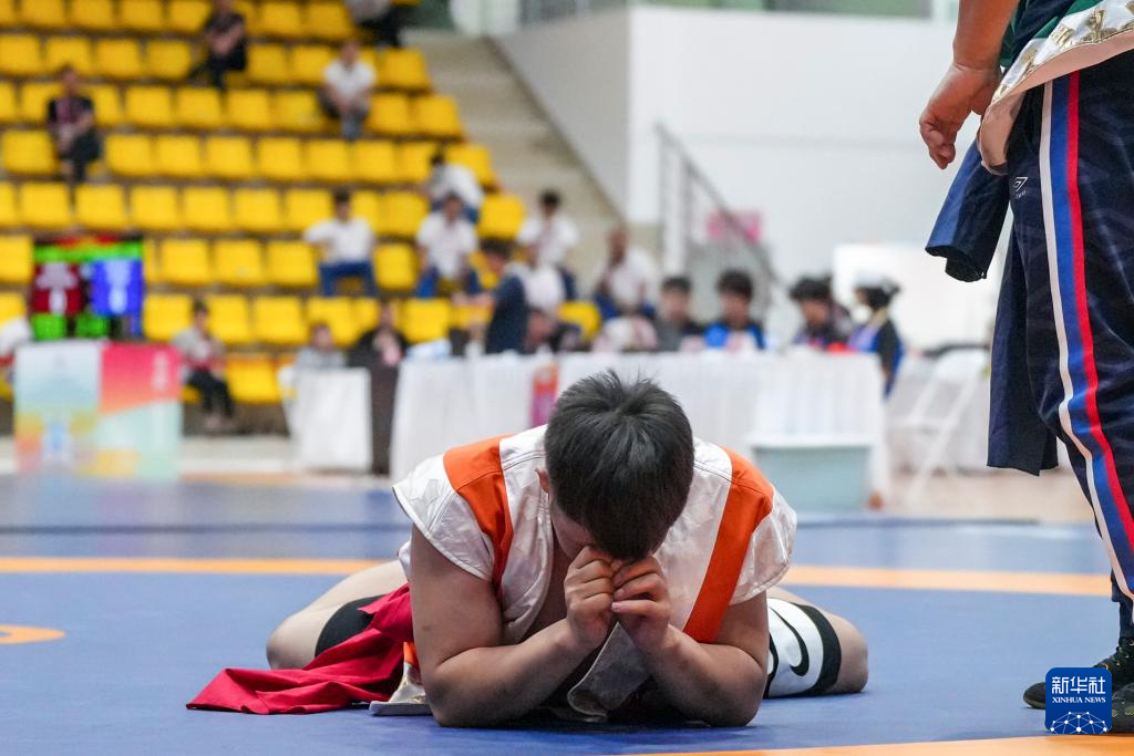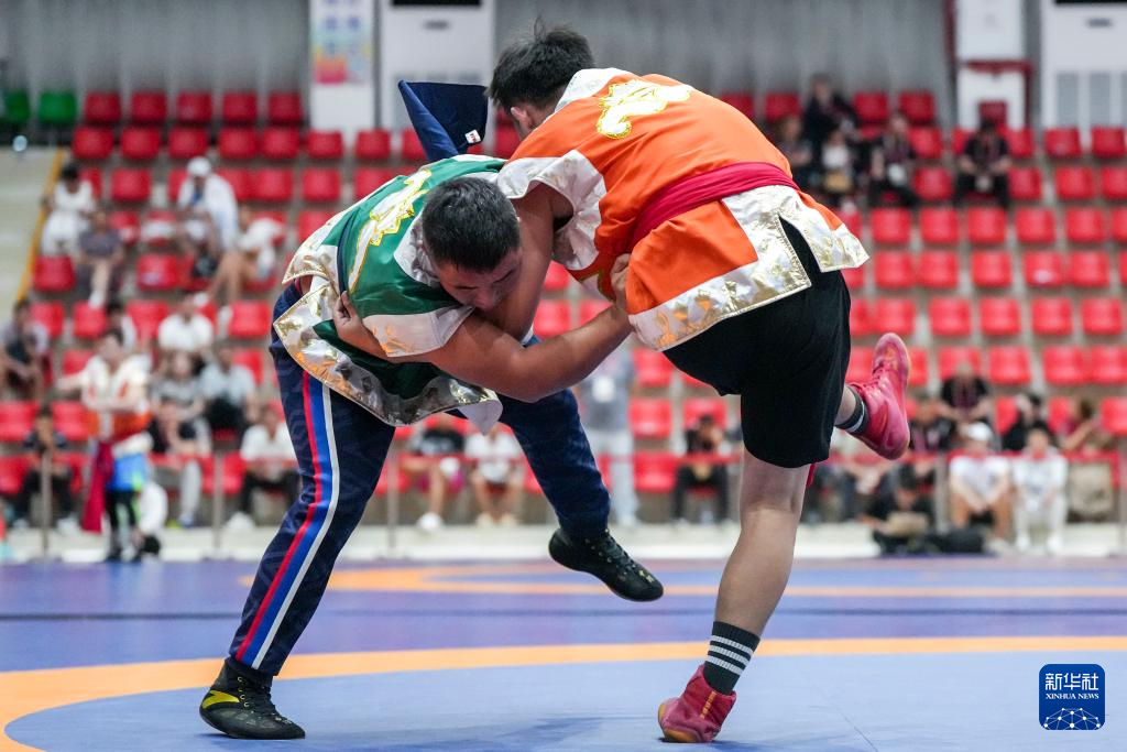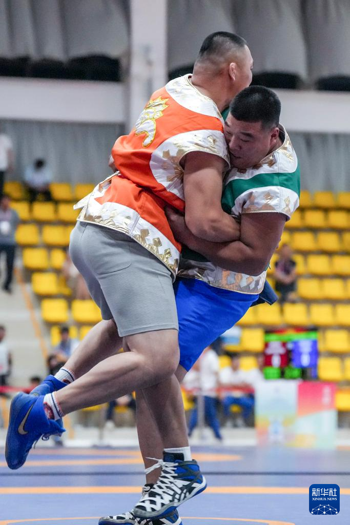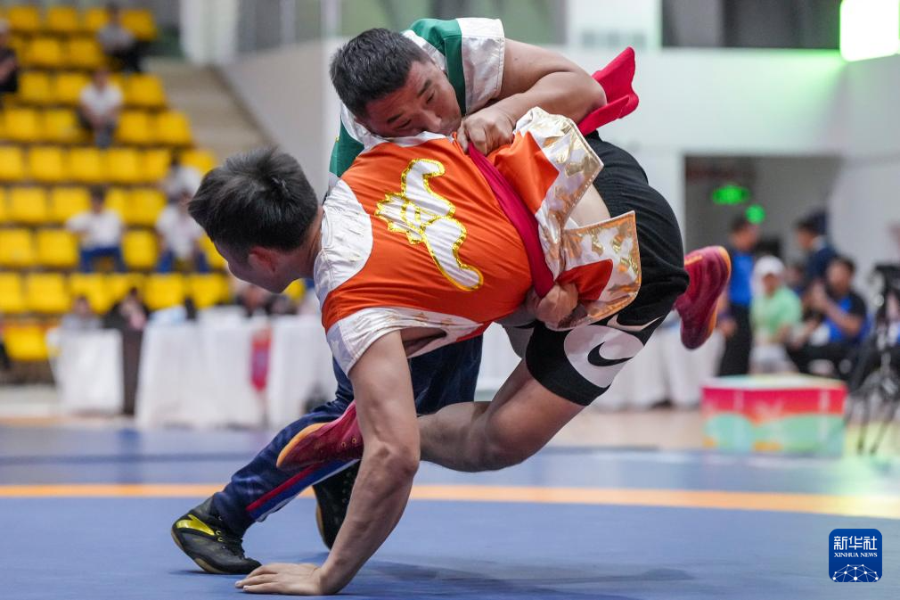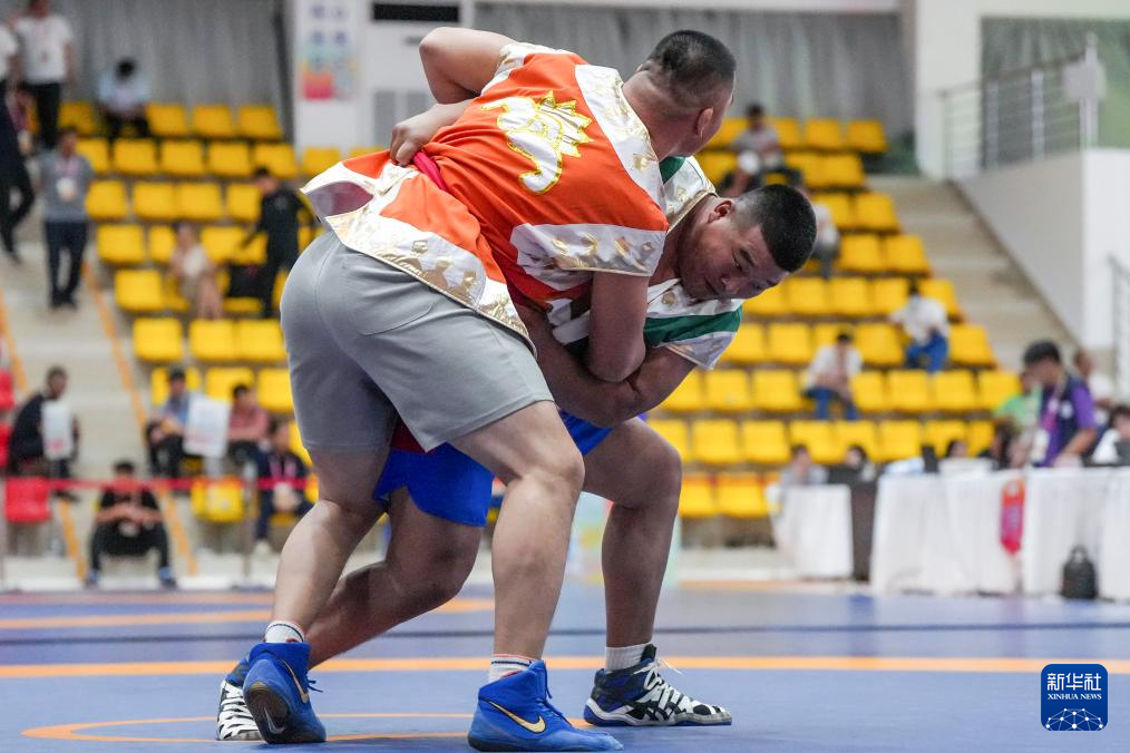 当日,第十二届全国少数民族传统体育运动会民族式摔跤且里西决赛在海南省三亚市举行。