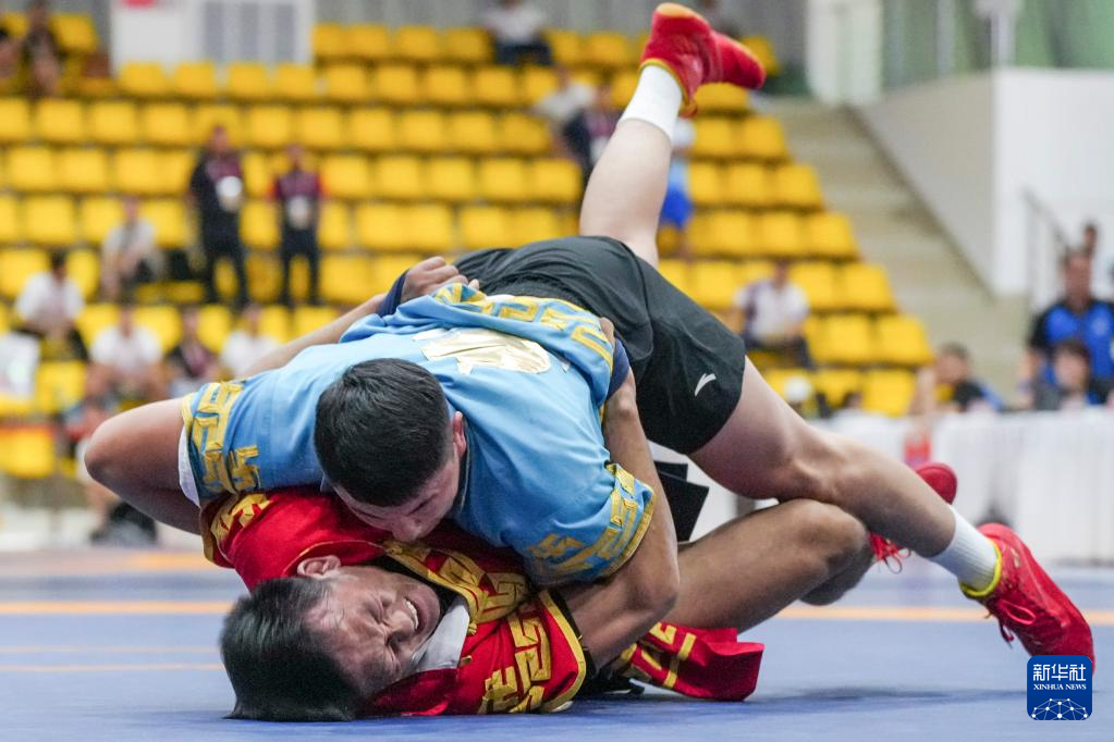 11月27日,天津队选手阿拉腾松布尔(上)与西藏队选手益西多吉在北嘎87公斤级决赛中。最终,阿拉腾松布尔战胜益西多吉,获得一等奖。