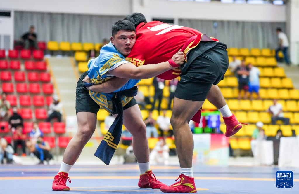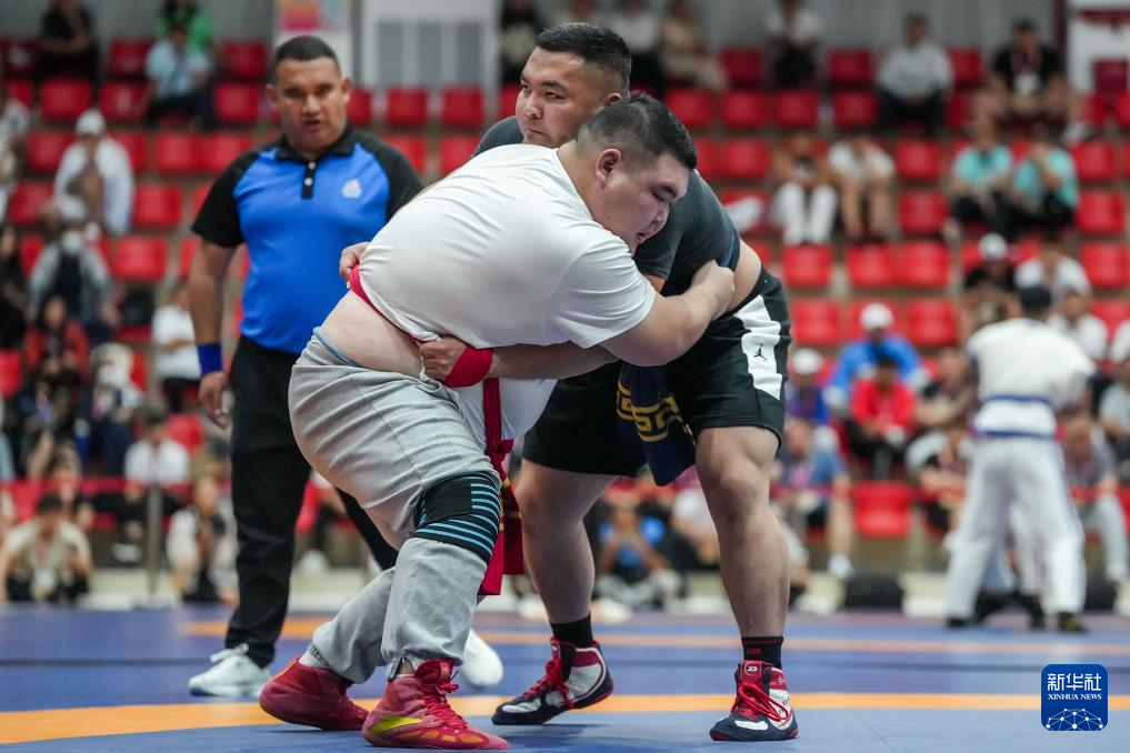 11月27日,天津队选手阿拉腾松布尔(左)与西藏队选手益西多吉在北嘎87公斤级决赛中。最终,阿拉腾松布尔战胜益西多吉,获得一等奖。