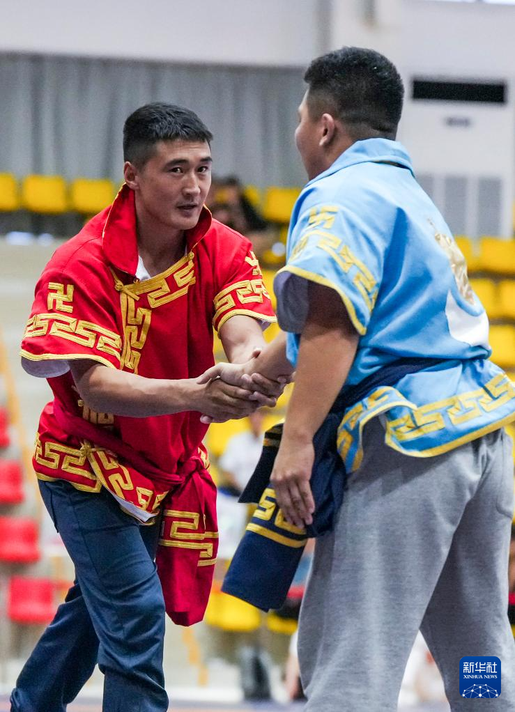 11月27日,海南队选手额尔敦朝古拉(左)与广东队选手布仁吉日嘎拉在比赛后握手致意。