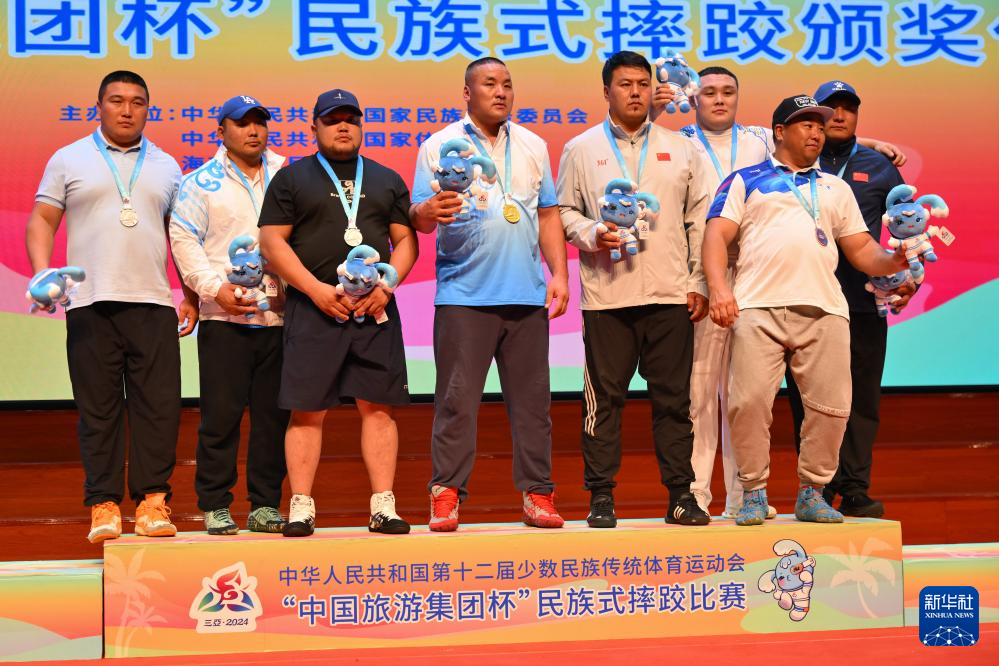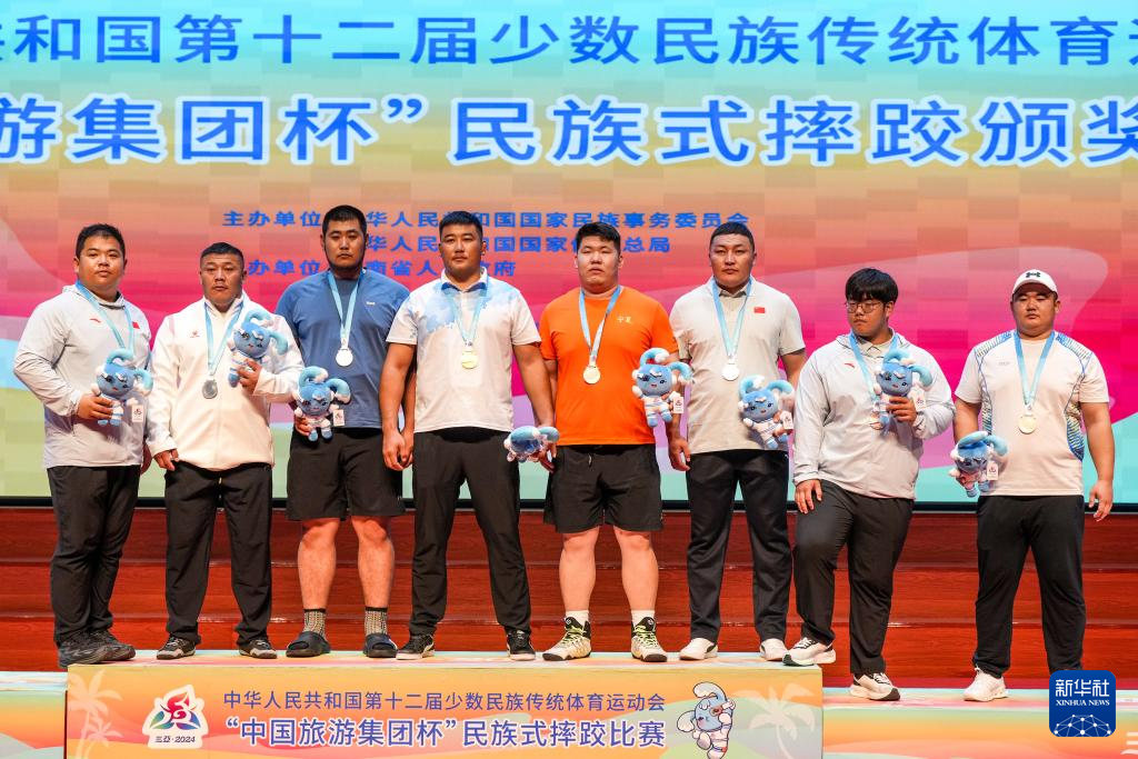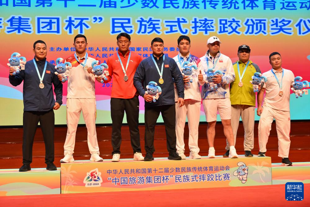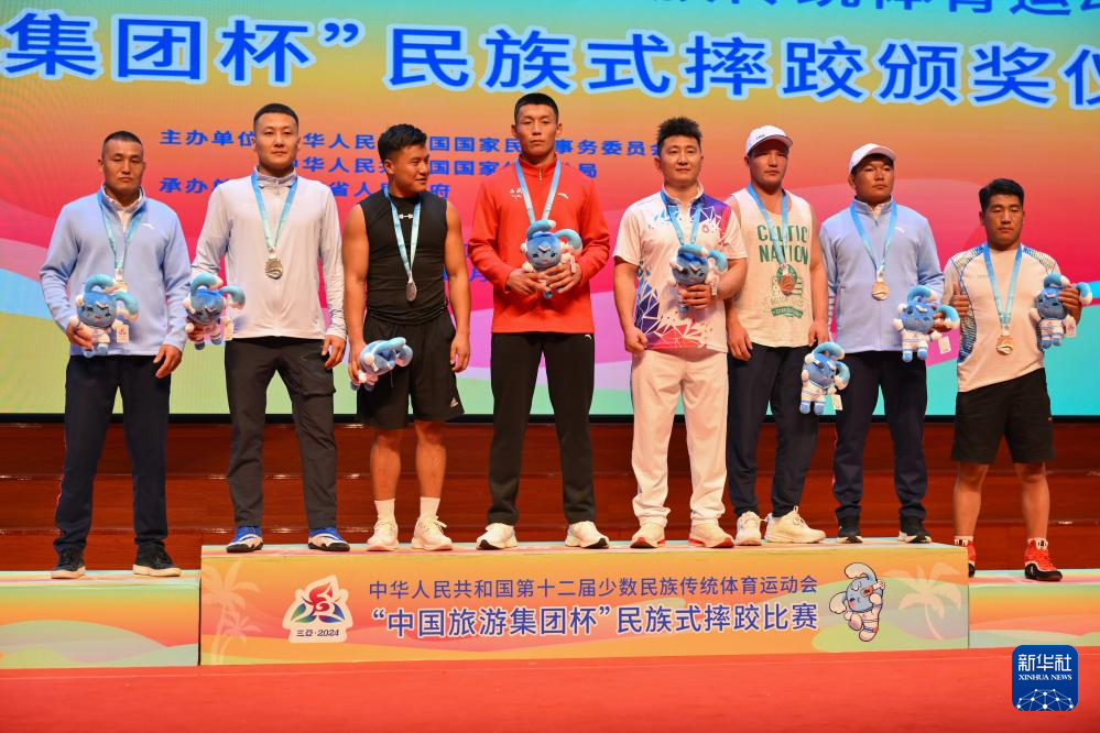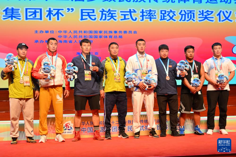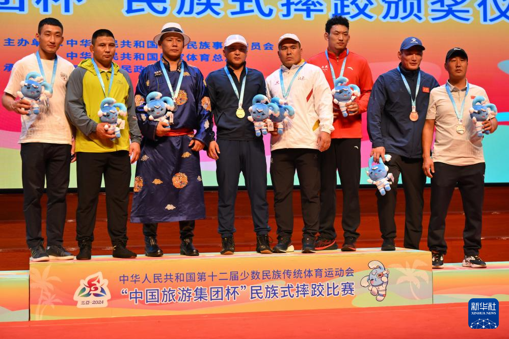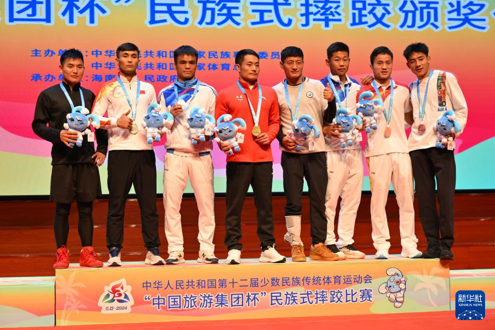 当日,第十二届全国少数民族传统体育运动会民族式摔跤项目颁奖仪式在海南省三亚市举行。