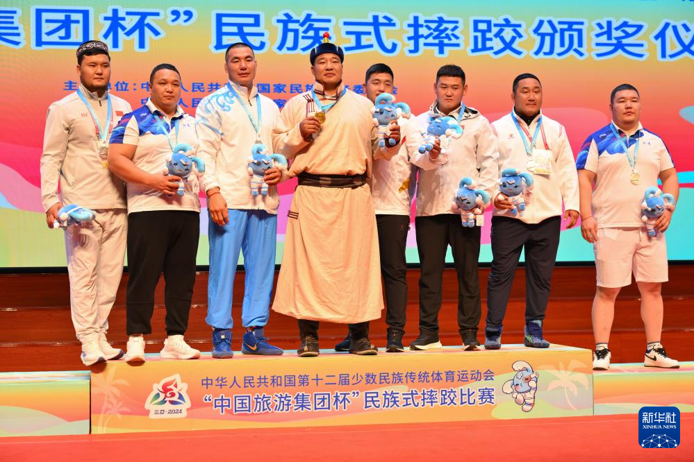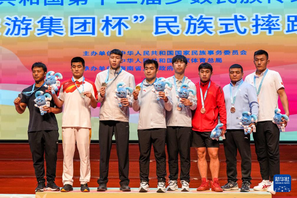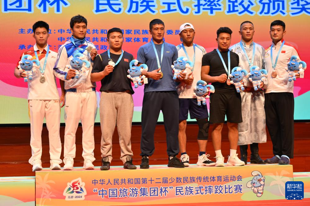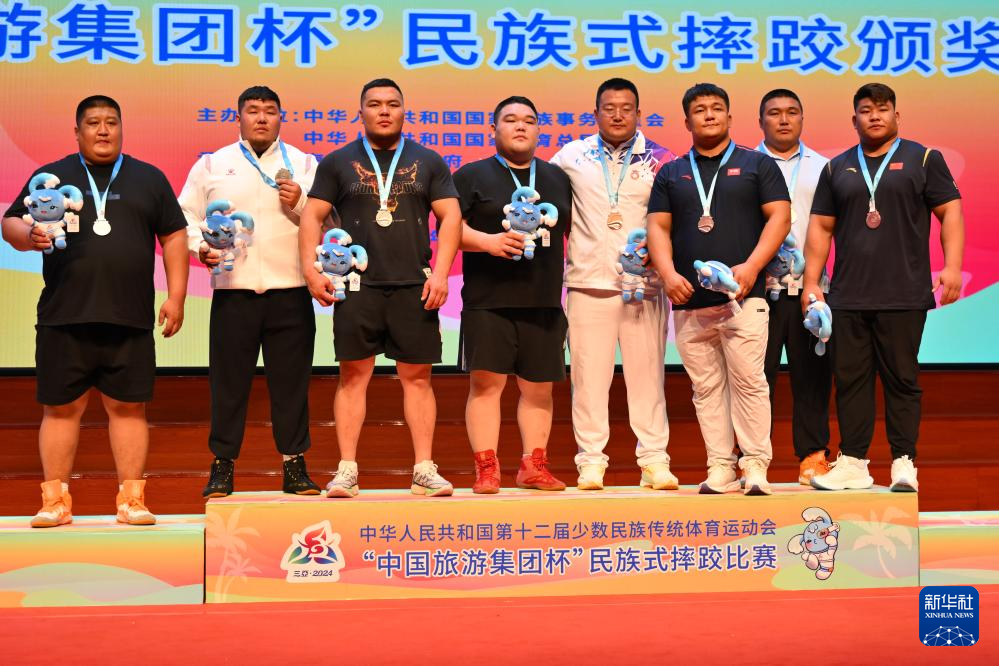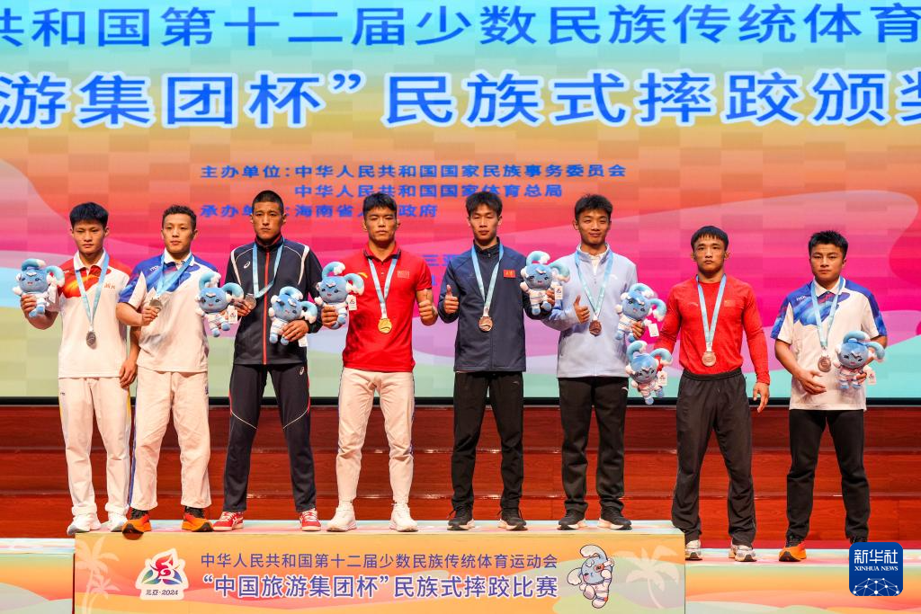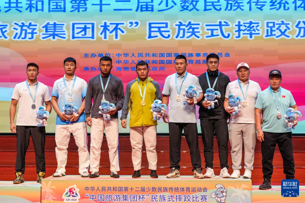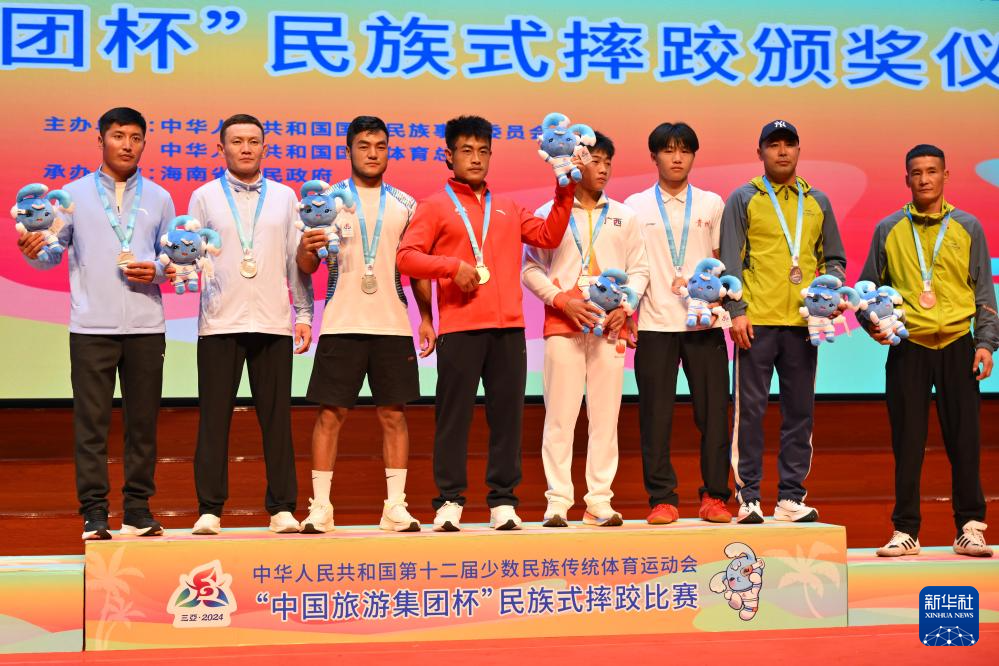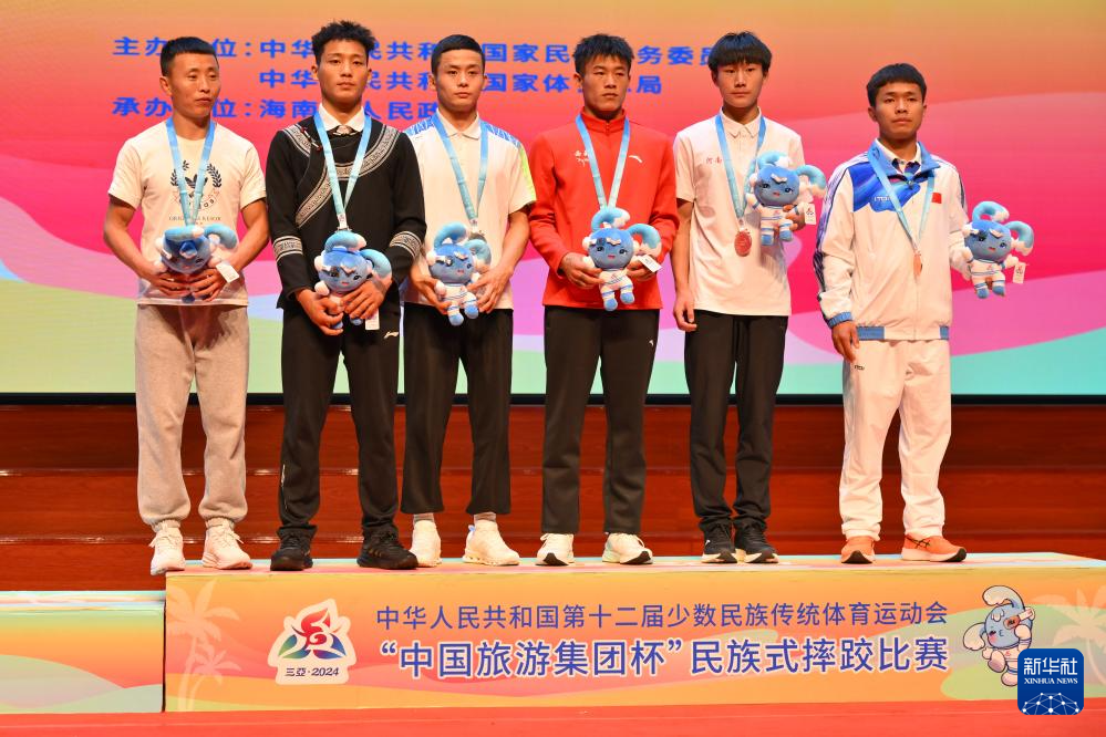 当日,第十二届全国少数民族传统体育运动会民族式摔跤项目颁奖仪式在海南省三亚市举行。
