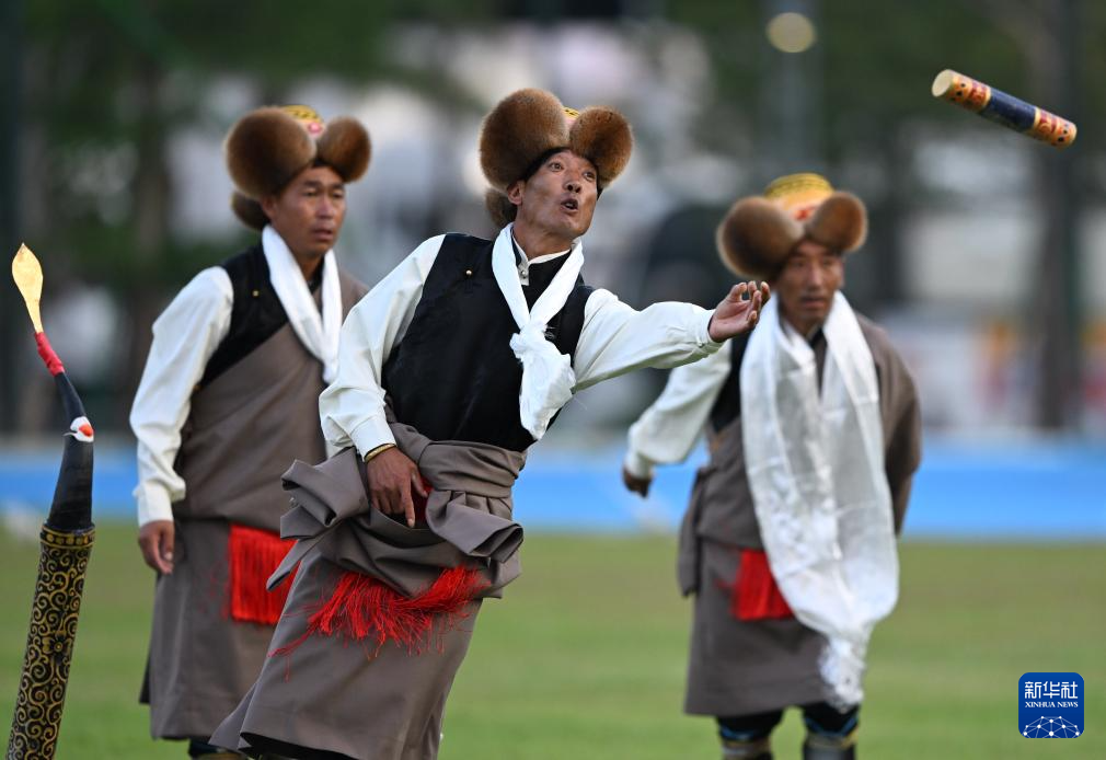 11月27日,西藏队选手表演打牛角。